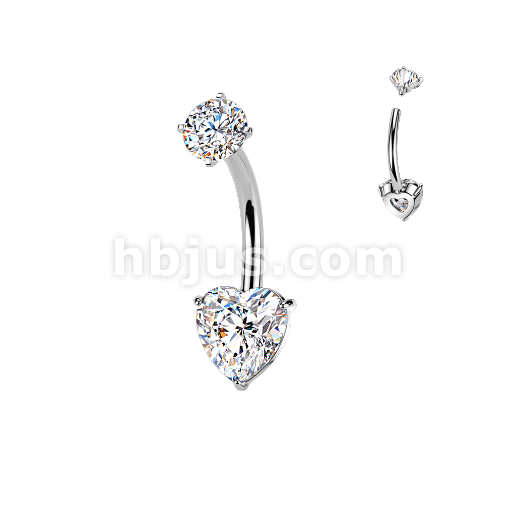 All 316L Internally Threaded Prong Set Heart CZ Belly Ring With CZ Top