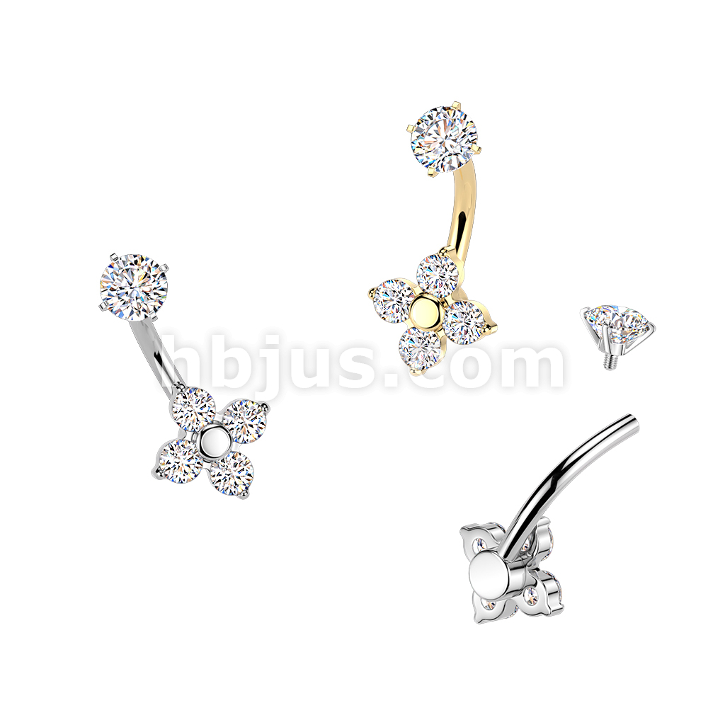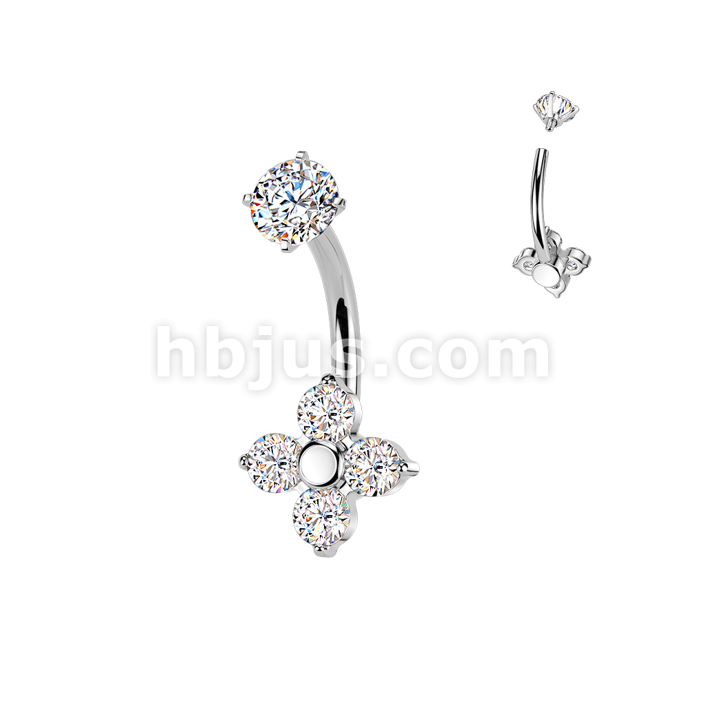 All 316L Internally Threaded Prong Set 4 CZ Flower Belly Ring With CZ Top