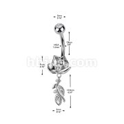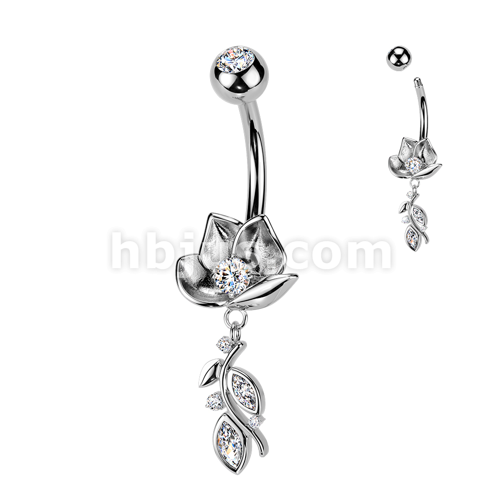 316L Belly Ring With Lotus Flower & CZ Vine Dangle