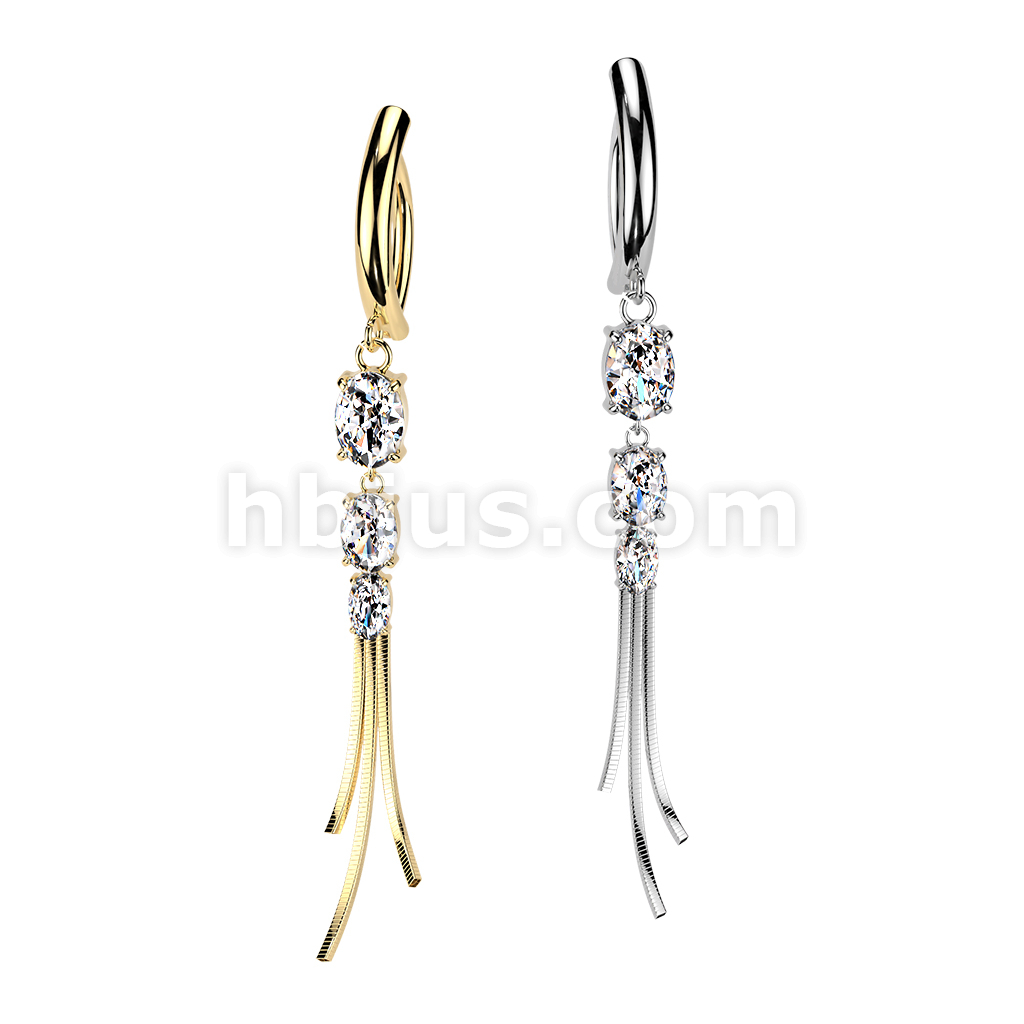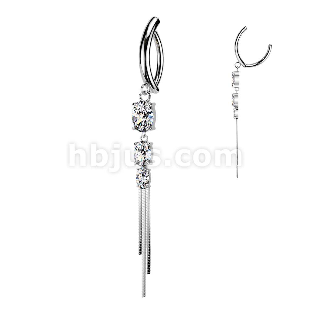 316L Hinged Belly Button Clicker Ring With Triple Oval CZ & Chain Dangle