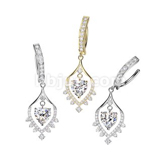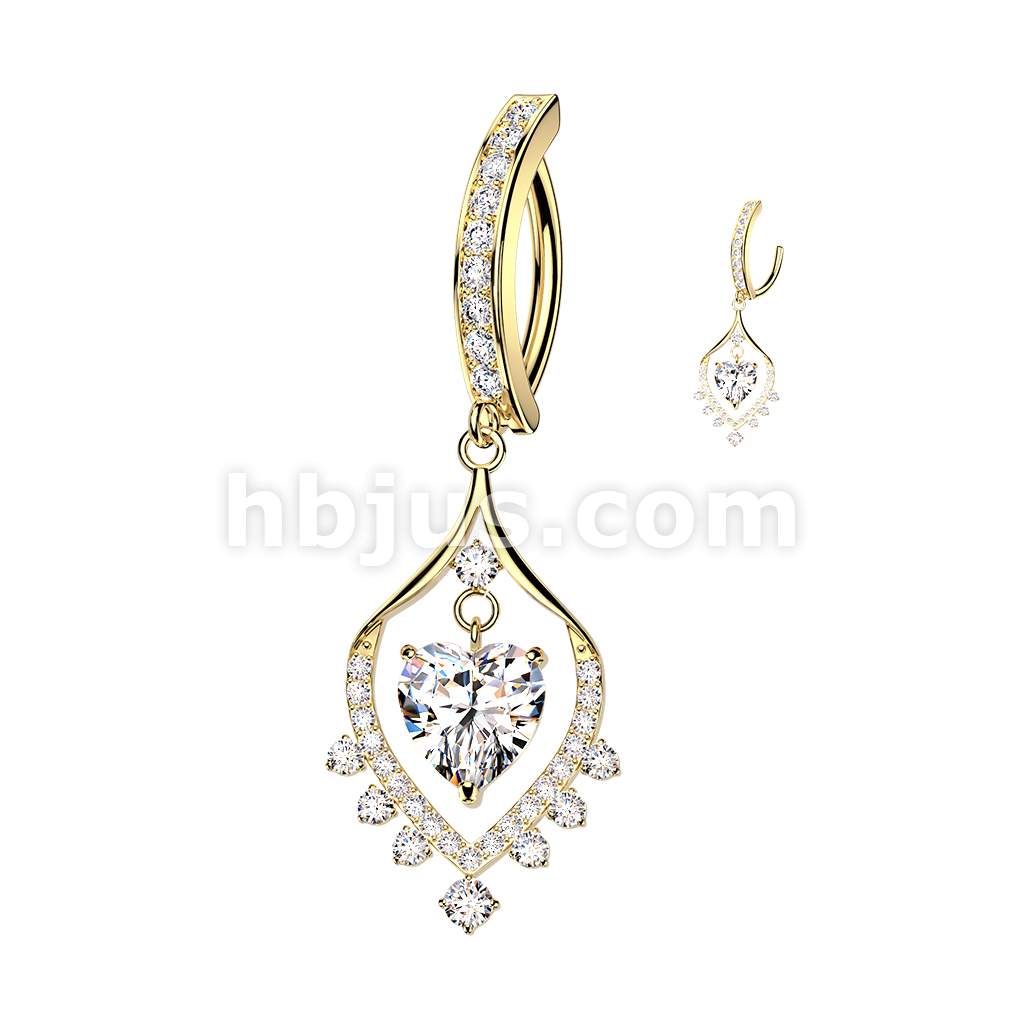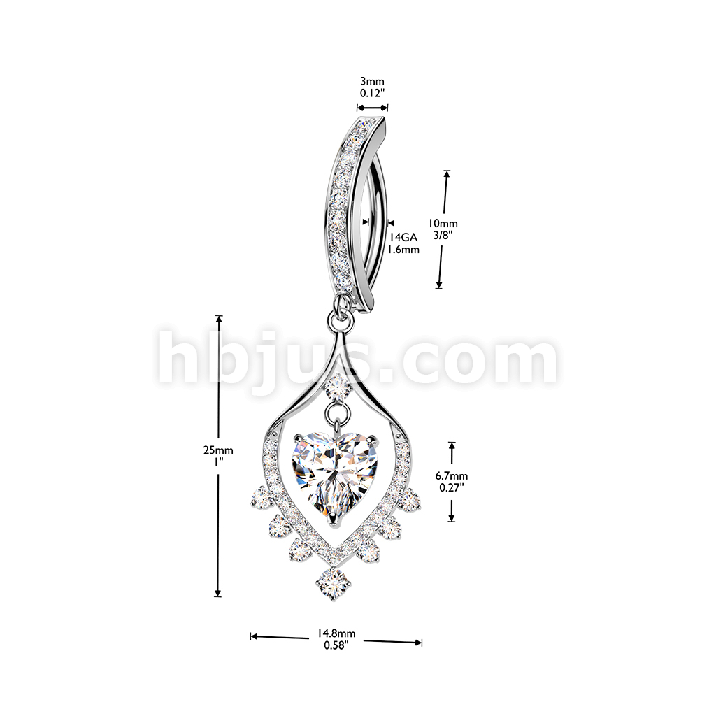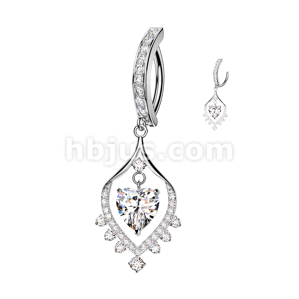 316L Hinged Pave CZ Belly Button Clicker Ring With Dancing Heart CZ Dangle
