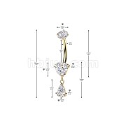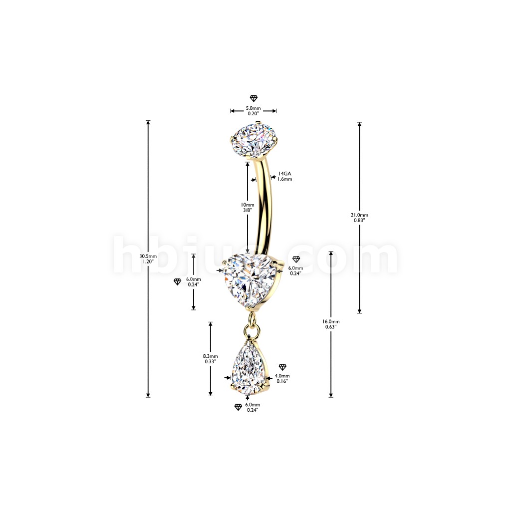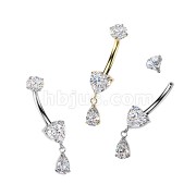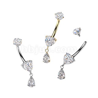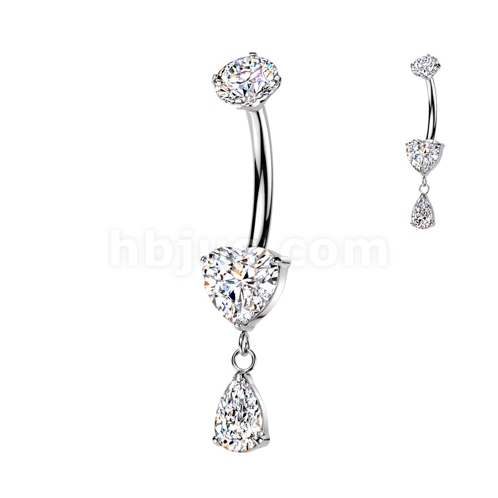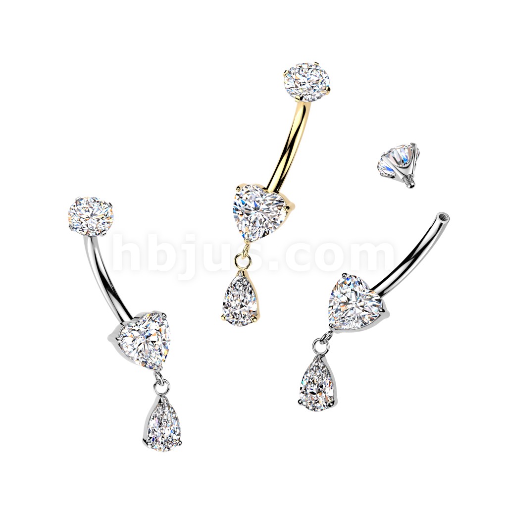 Titanium Internally Threaded Prong Set Heart CZ Belly Ring With Teardrop CZ Dangle