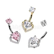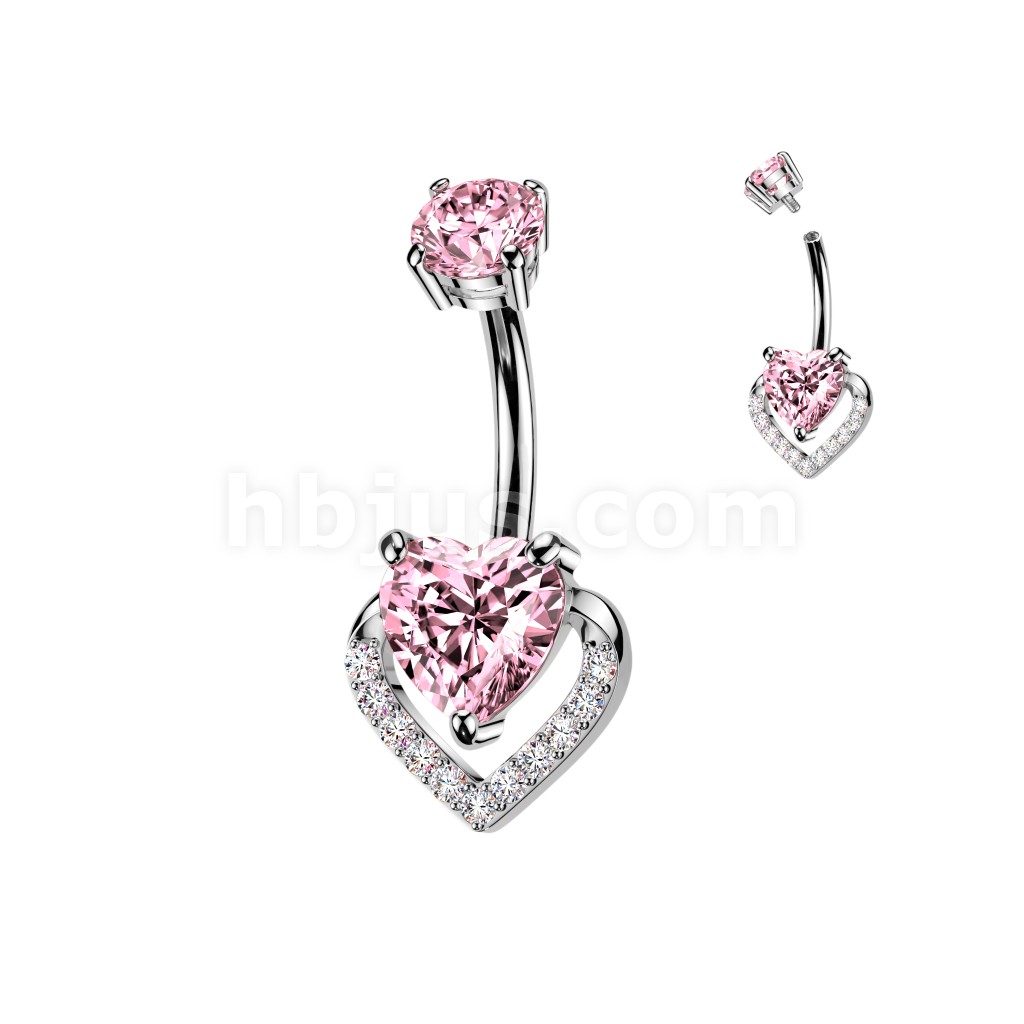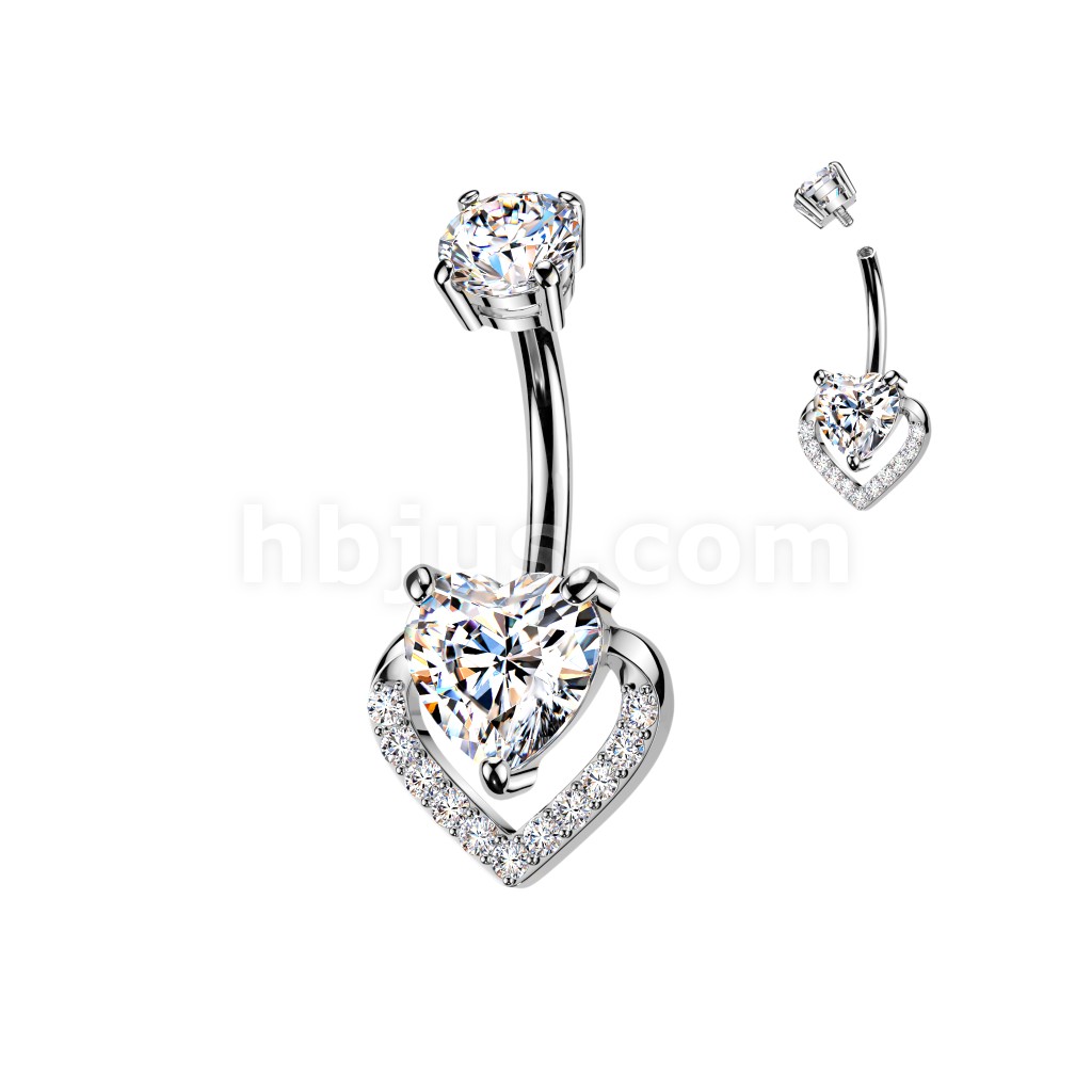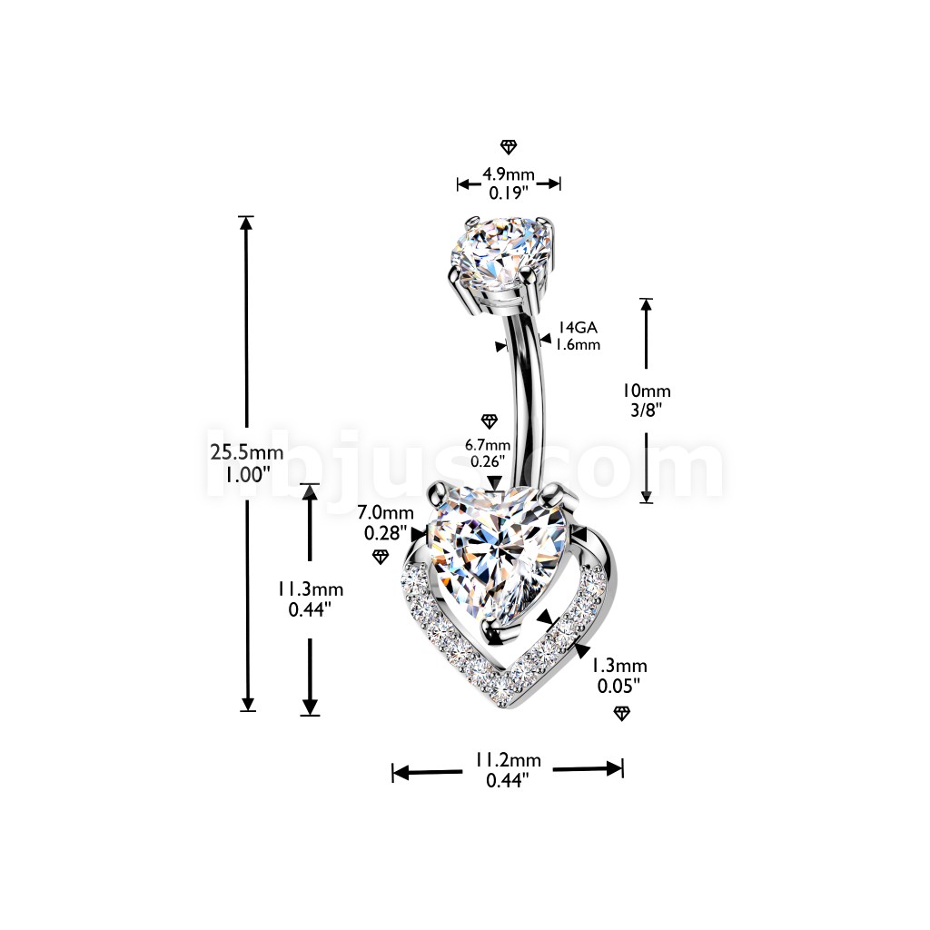 316L Internally Threaded Belly Ring With Pave CZs & Prong Set Heart CZ