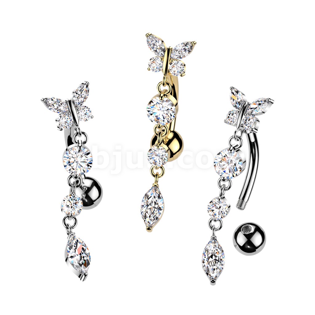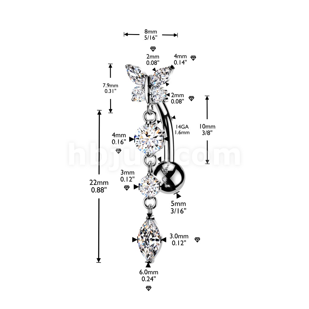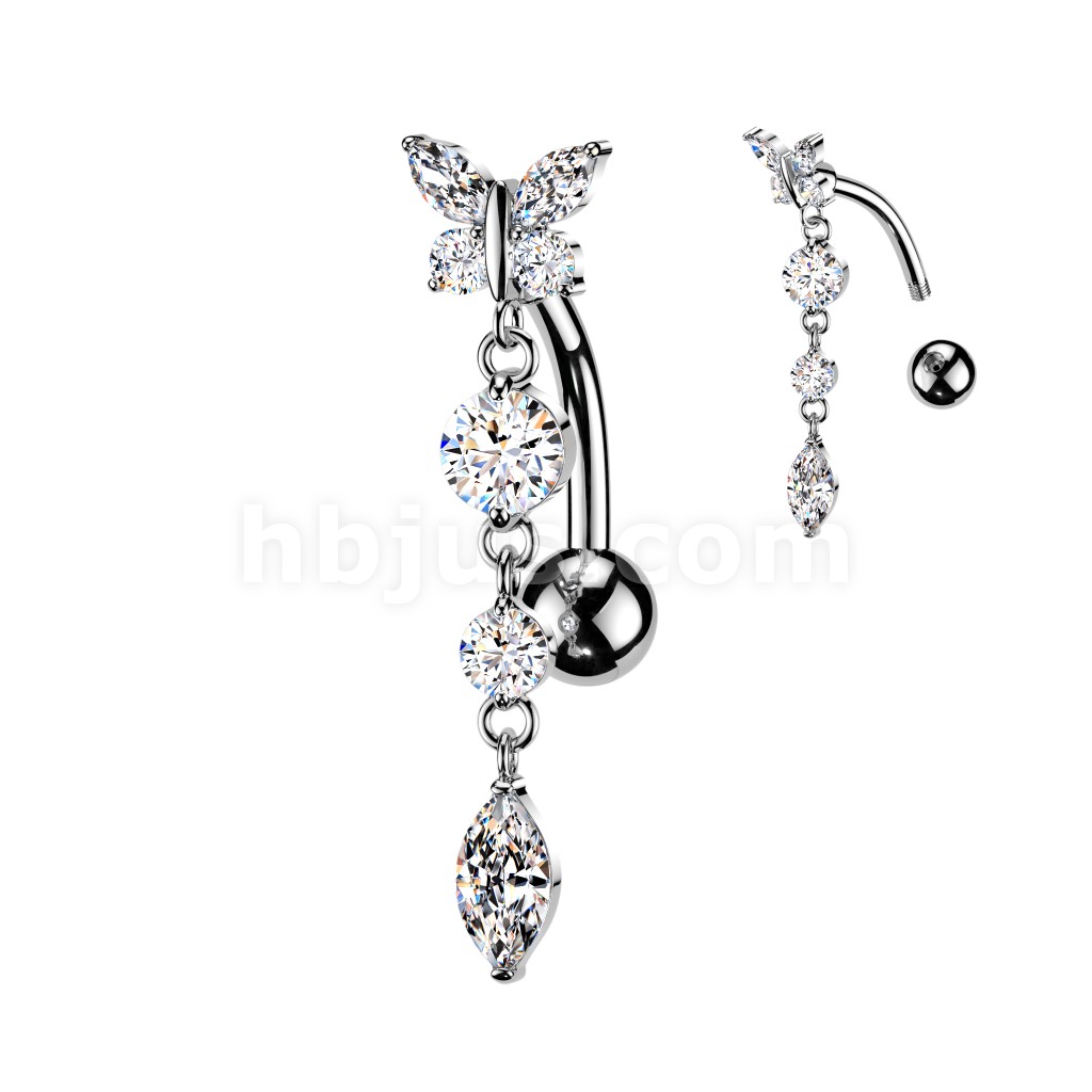 316L CZ Butterfly Top Down Reverse Belly Ring With Round & Marquise CZ Dangle