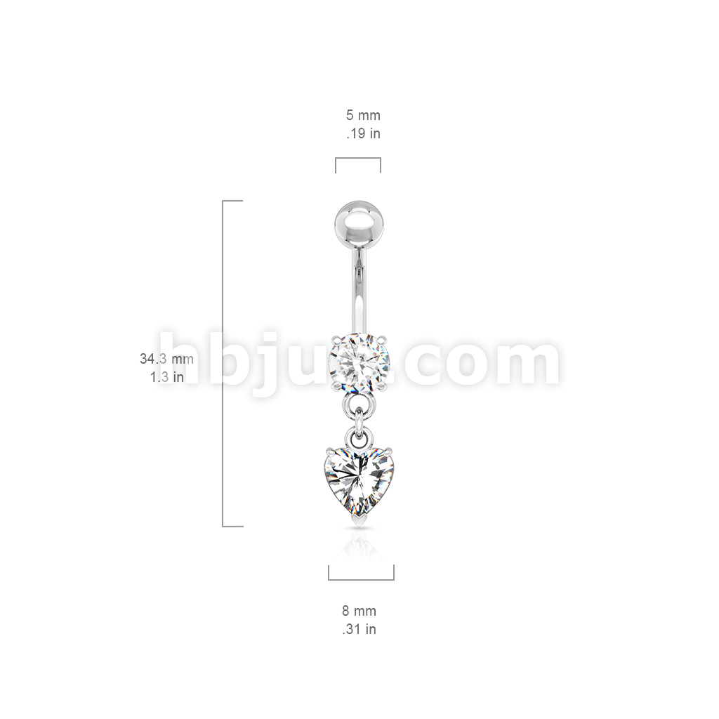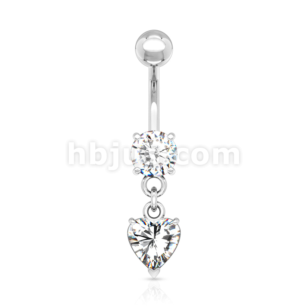 316L Surgical Steel Round CZ Prong Set Heart CZ Dangle Belly Button Ring