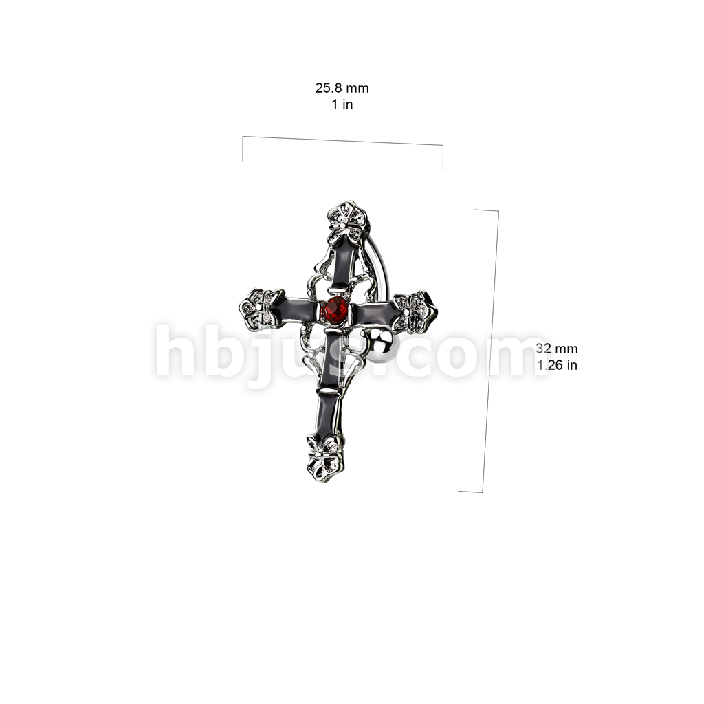 316L Surgical Steel Top Drop Navel Ring Black Enamel Colored Cross With Red Gem Center Belly Button Ring