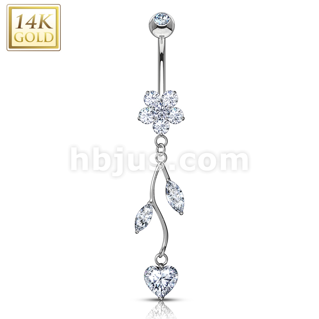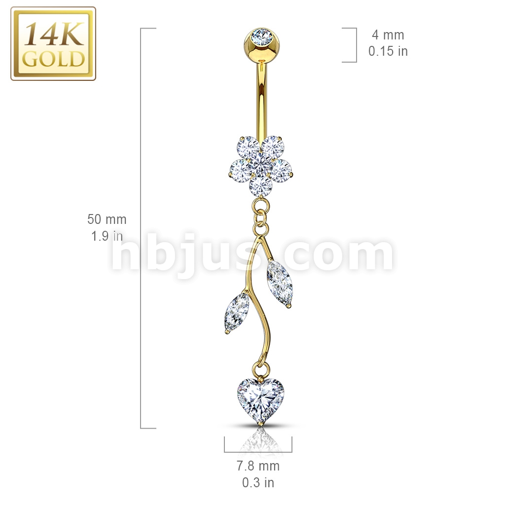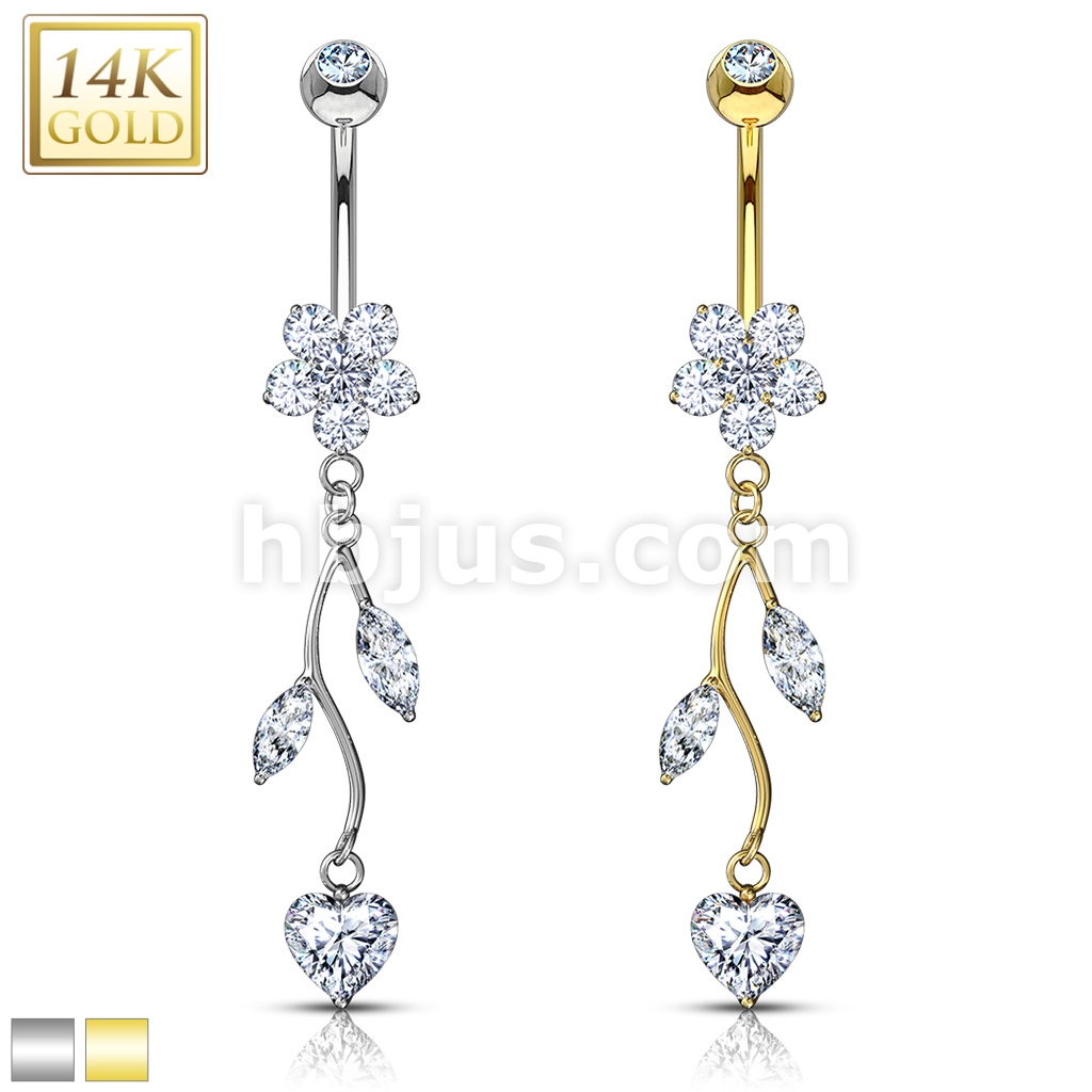 14K Gold Vine CZ Dangle Flower Navel Belly Button Ring