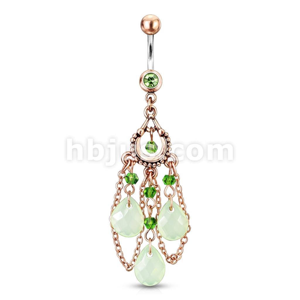 316L Surgical Steel Vintage Navel Ring With Peridot , Beads and 3-Pear Shaped Jade Color Light Green Aventurine Dangles Belly Button Ring