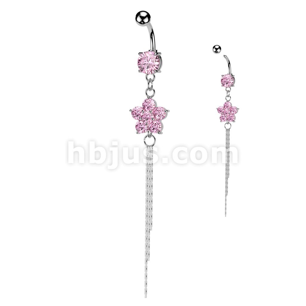316L Surgical Steel 6mm CZ/6-CZ Flower With 3 Chains Dangle Belly Button Ring