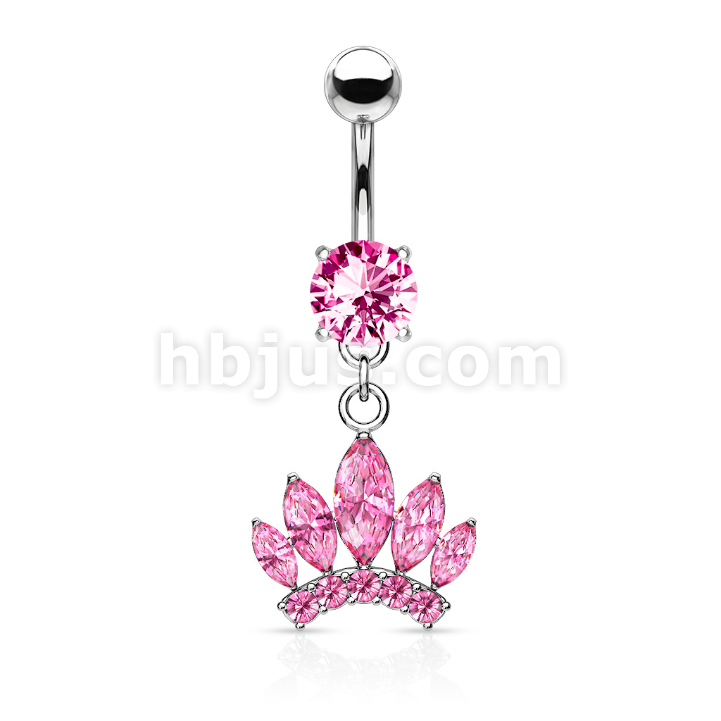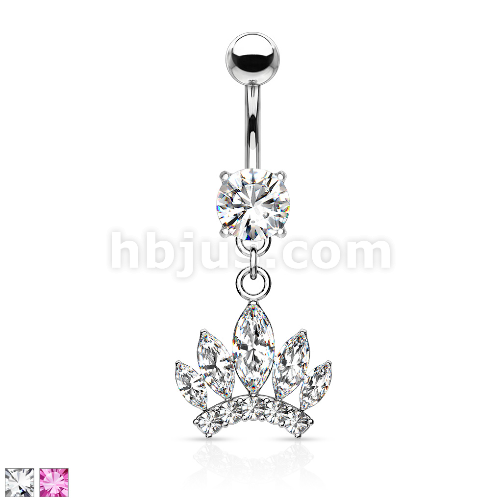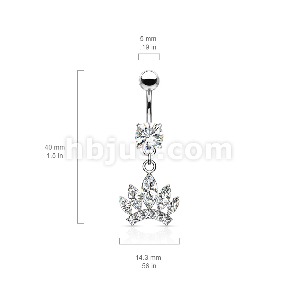 316L Surgical Steel Marquise Cut Gem Paved Crown Dangle CZ Prong Set Belly Button Ring