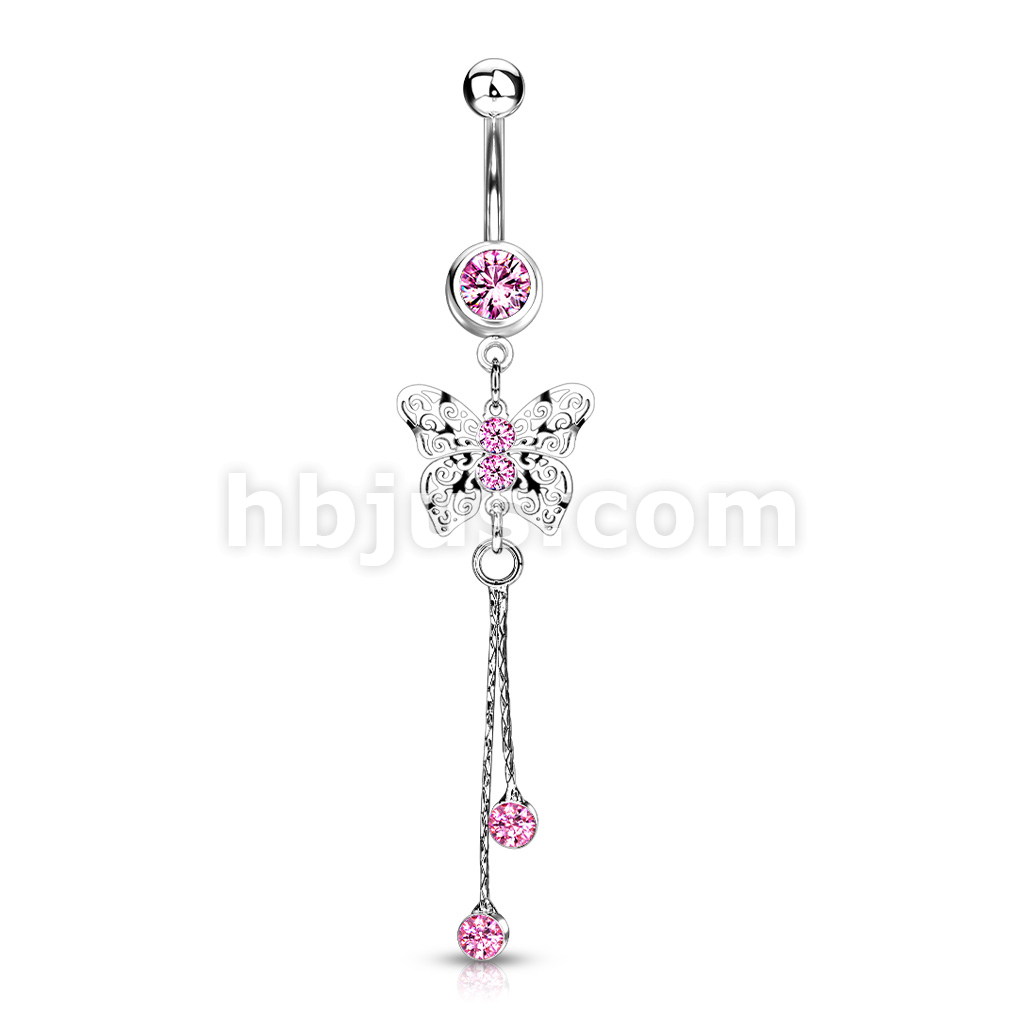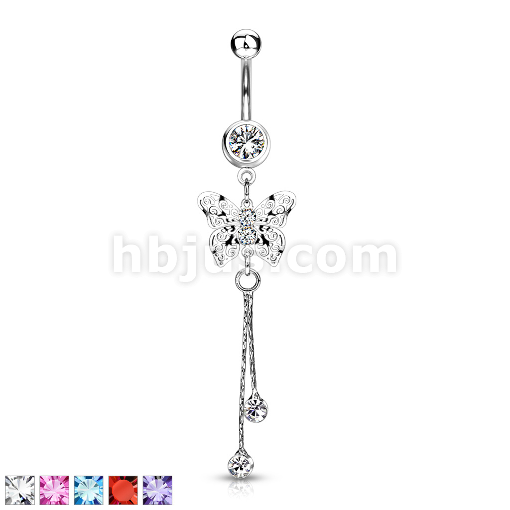316L Surgical Steel Laser Cut Royal Butterfly With CZ Dangle Belly Button Ring
