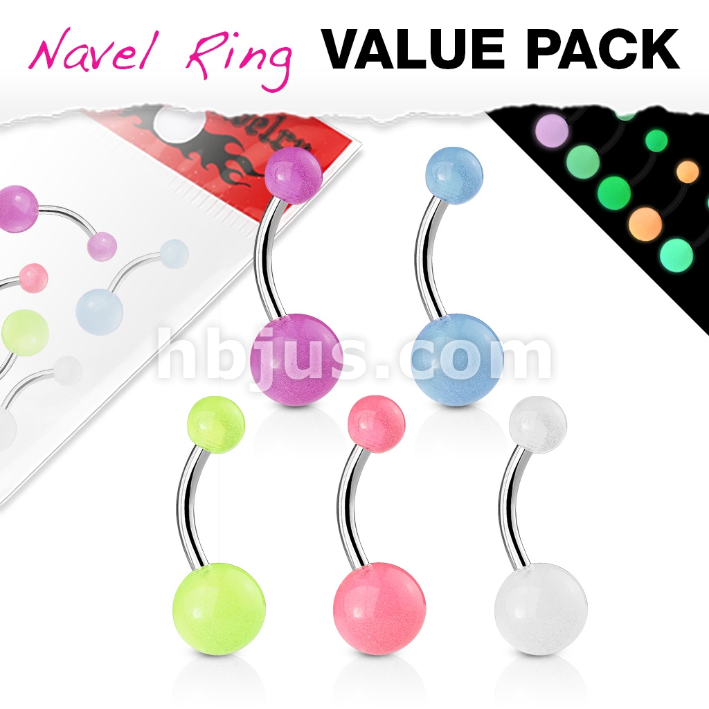 5 Pcs Value Pack of Assorted Color 316L Surgical Steel Navel Rings with Glow In The Dark Balls