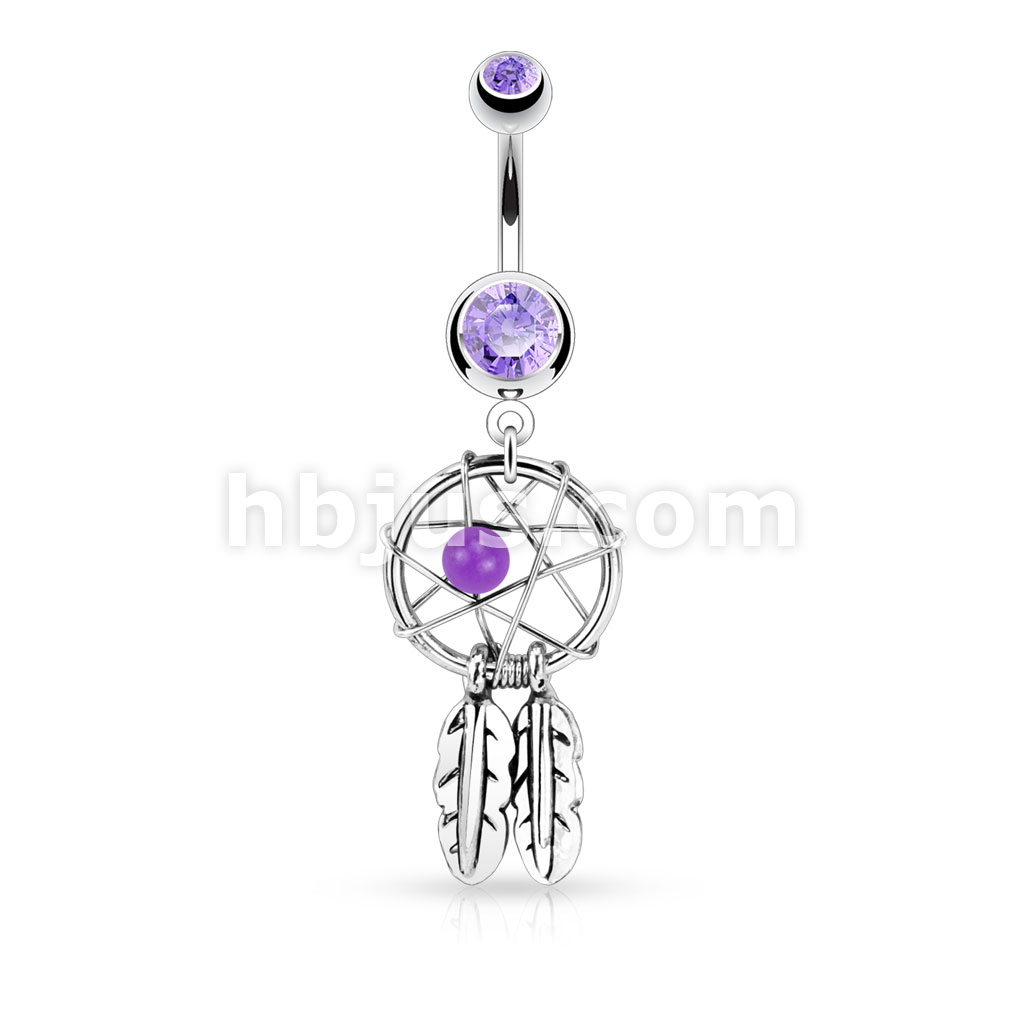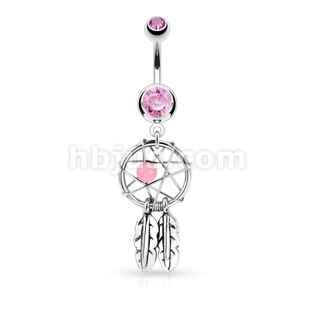 316L Surgical Steel Dream Catcher Woven Star Design With Bead and Feathers Fancy Belly Button Ring