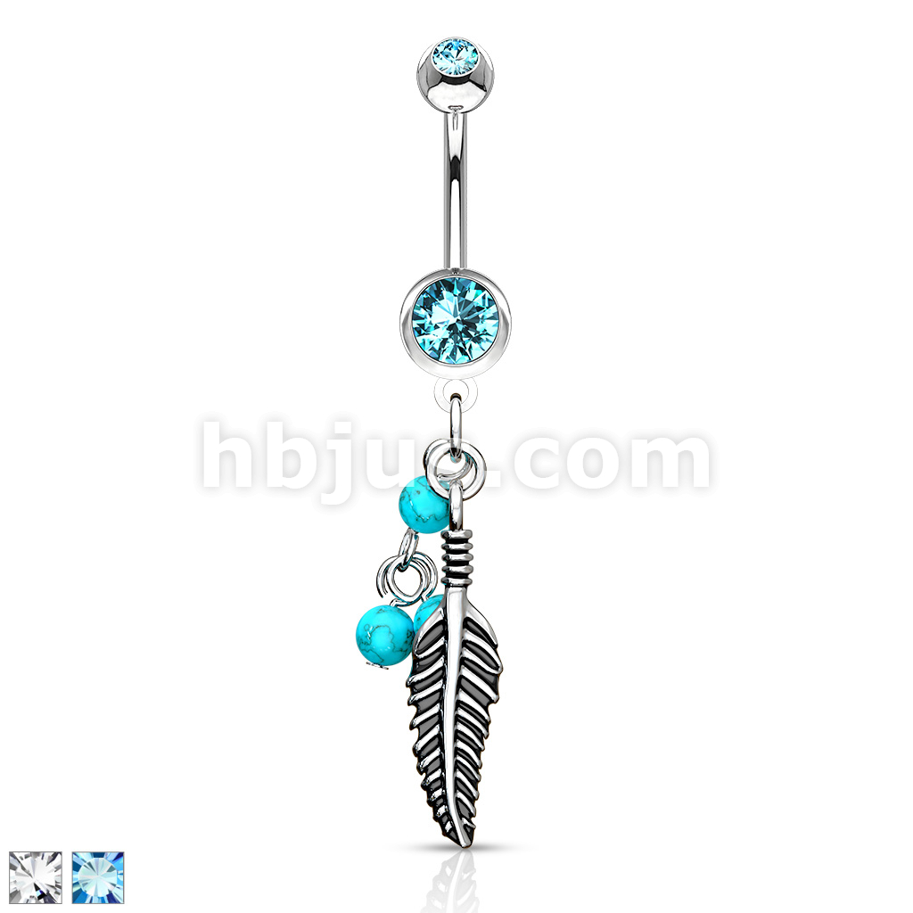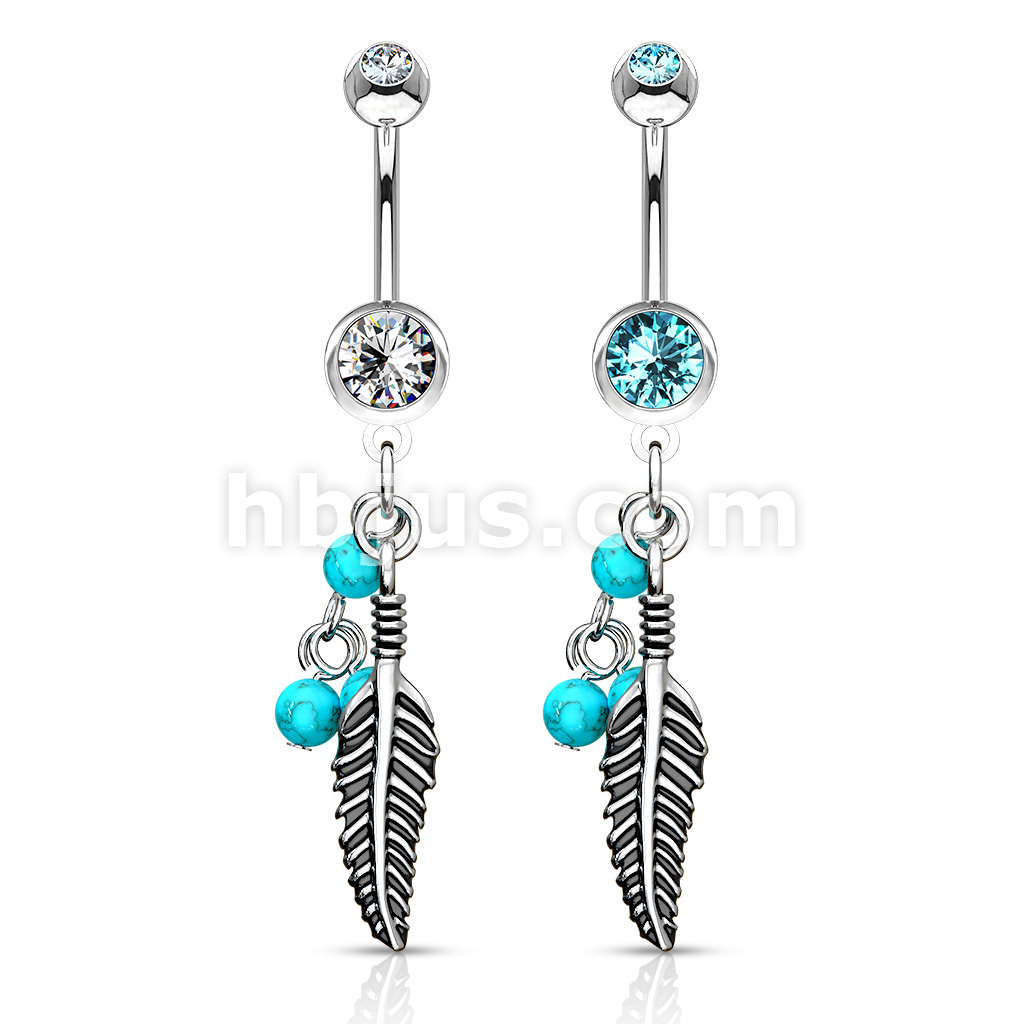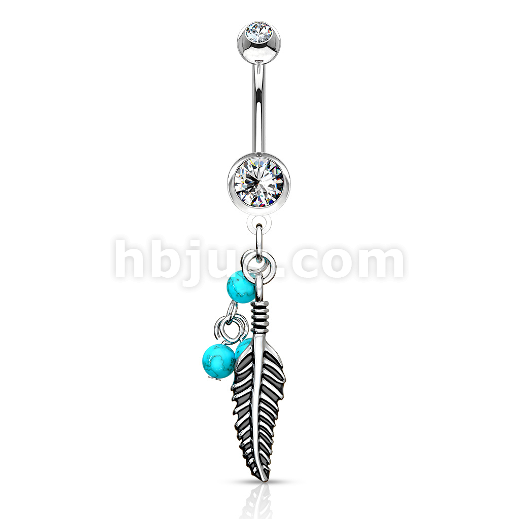 316L Surgical Steel Feather Dangle With Blue Turquoise Semi Precious Stone Beads Navel Ring
