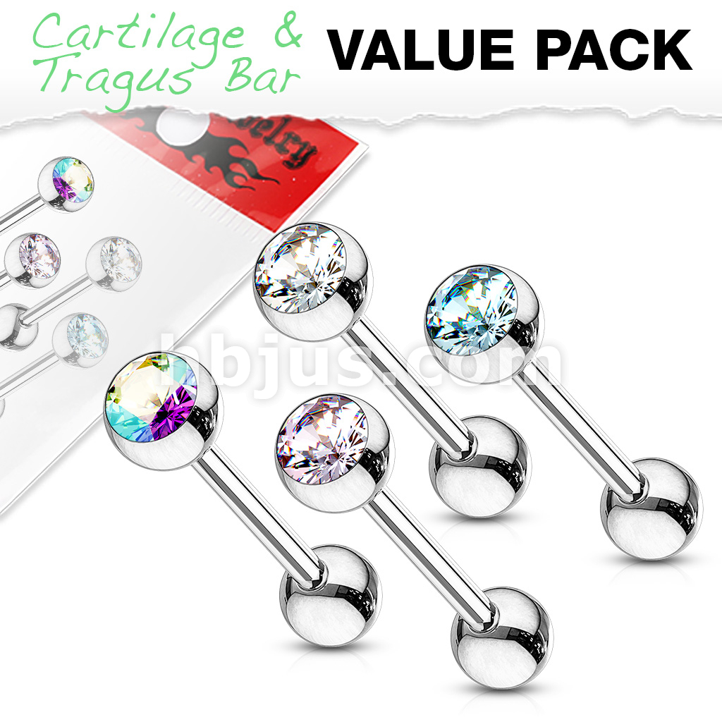 4 Pcs Value Pack of Assorted 316L Surgical Steel Barbell w/ Press Fit Gem Set Ball