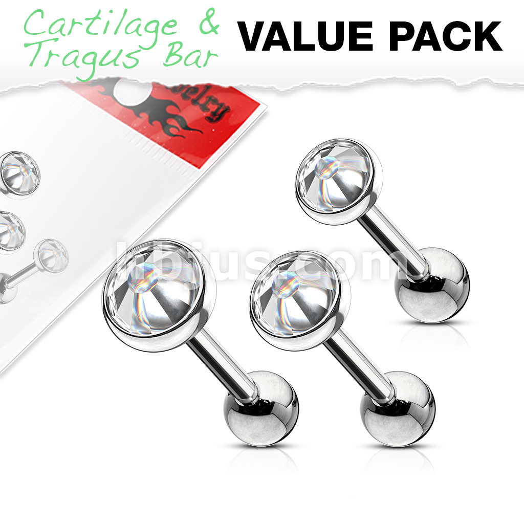 3 Pcs Value Pack of Assorted 316L Tragus Bar with Clear Gem Top
