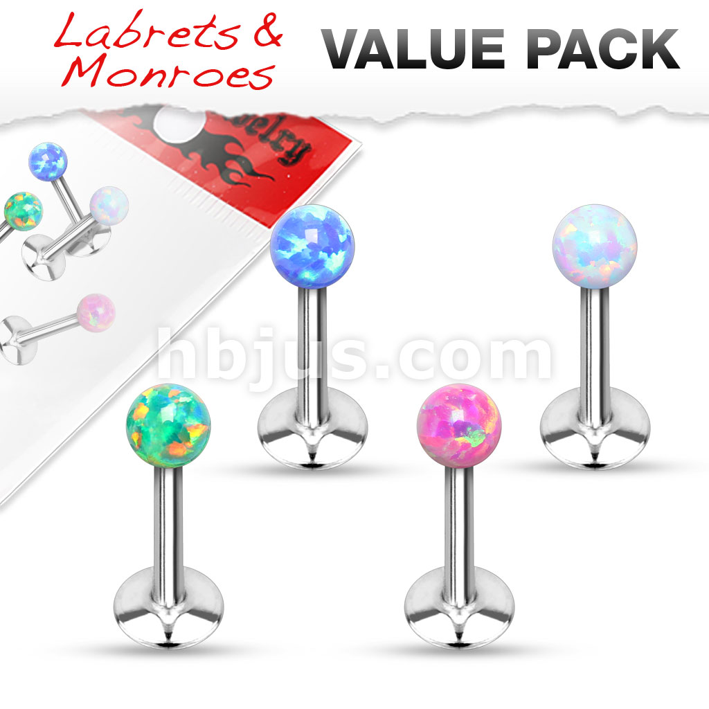 Value Pack 4 Pcs Internally Threaded 316L Surgical Steel Labret/Monroe with Opal Ball Top