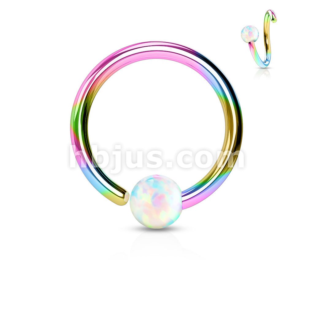 Rainbow IP Plated 316L Surgical Steel White Opal Ball Fixed On End Hoop Rings