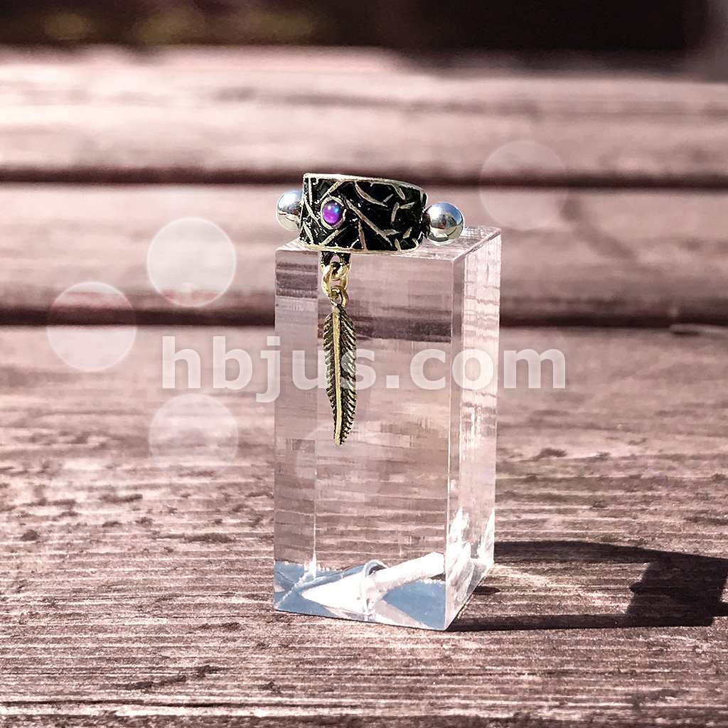 Blue Opal Centered Antique Gold IP Tribal Net With Feather Dangle Ear Cartilage/Helix Cuff 316L Surgical Steel Barbells