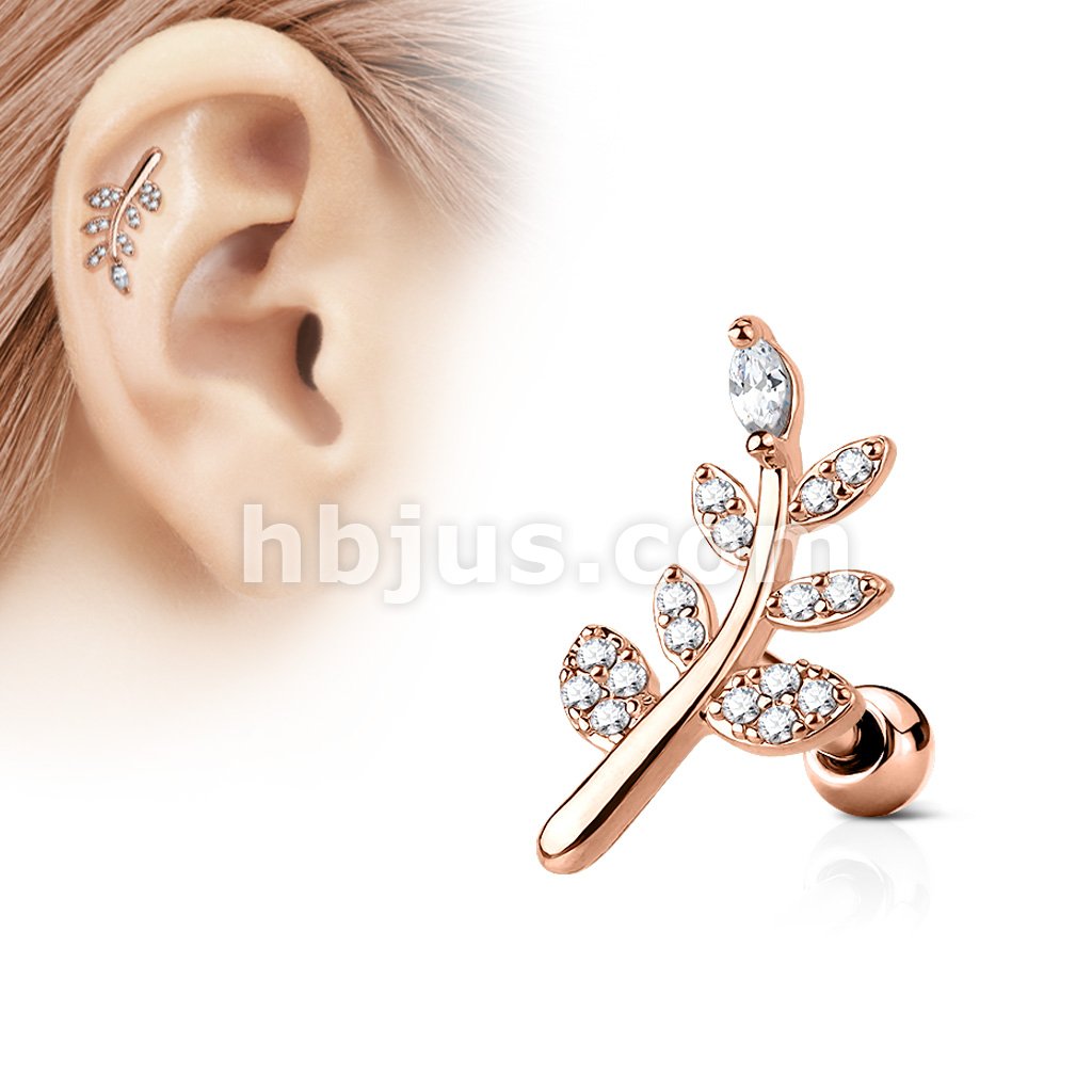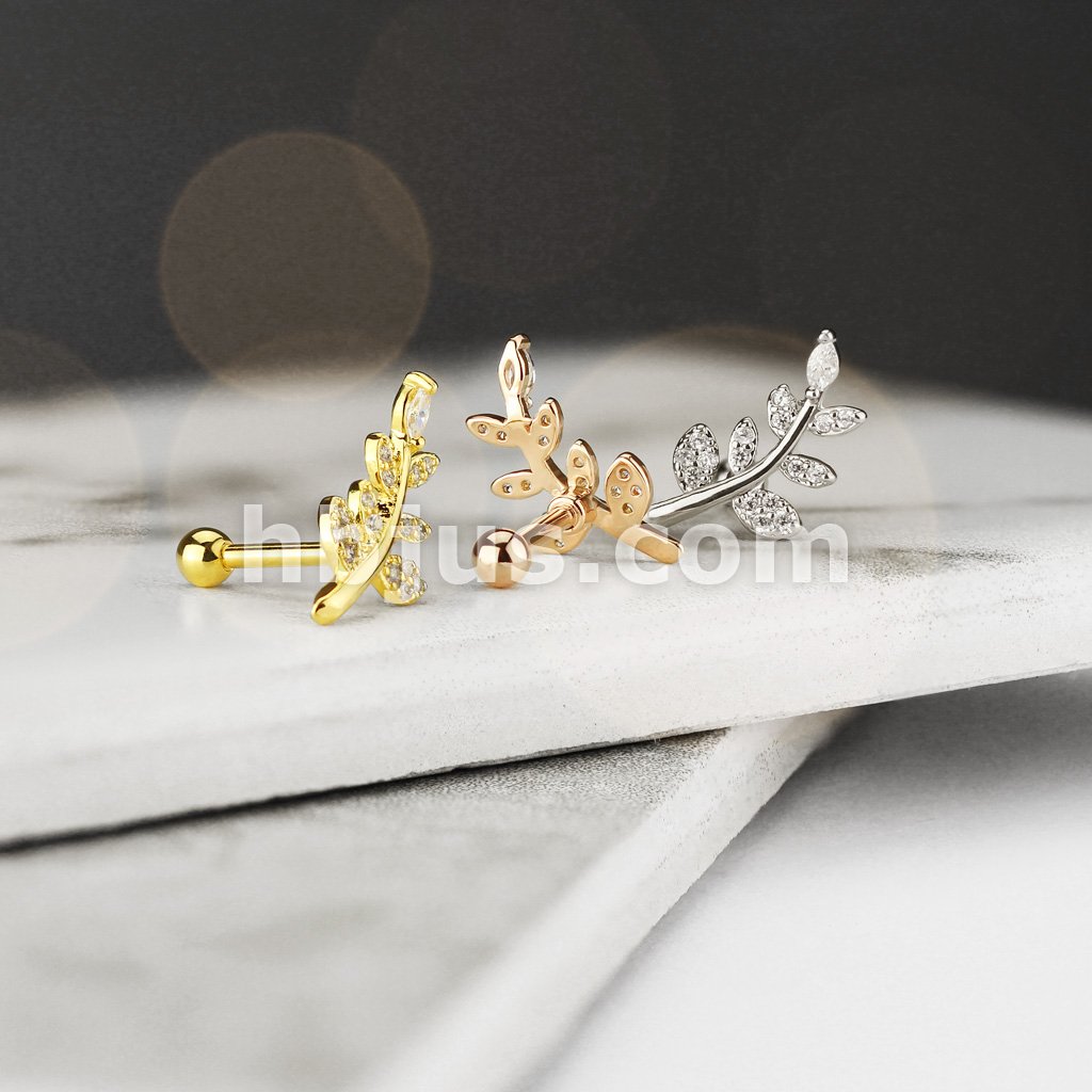 CZ Micro Paved Leaf Top 316L Surgical Steel Cartilage, Tragus Barbell Studs