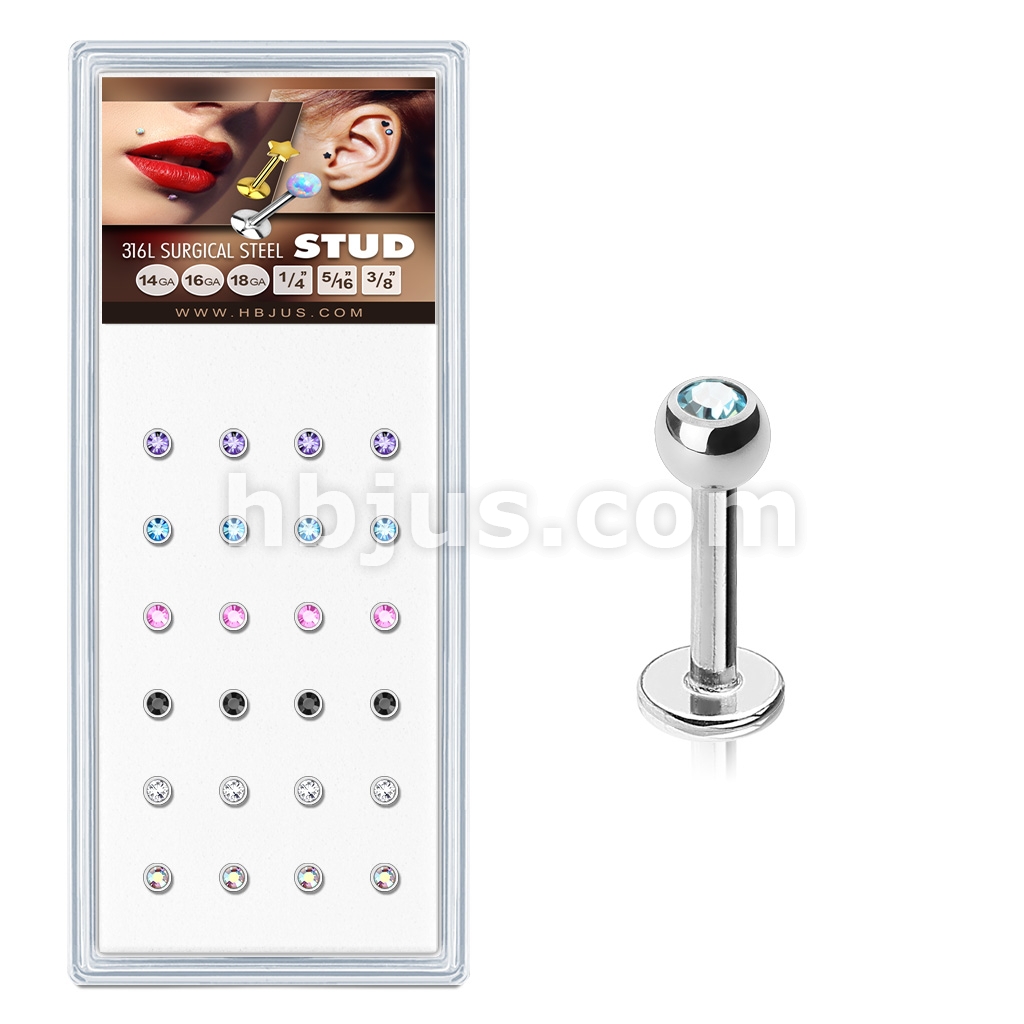 24 Pcs Pre Loaded Press fit Mixed Color Gem Ball 316L Stud Pack for Labret, Lip, Monroe and Ear Cartilage