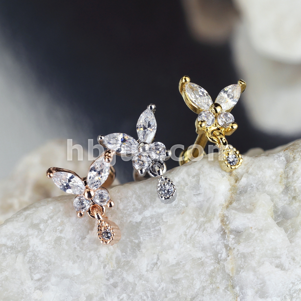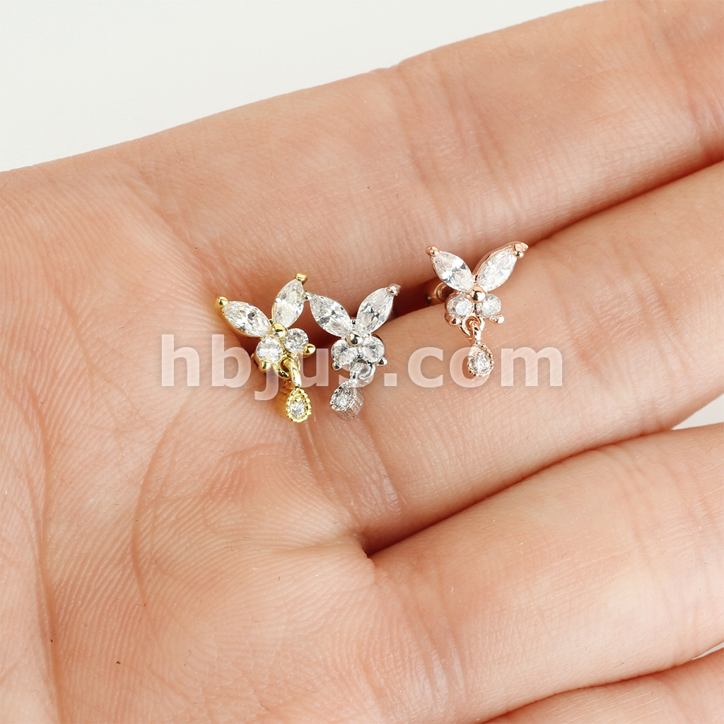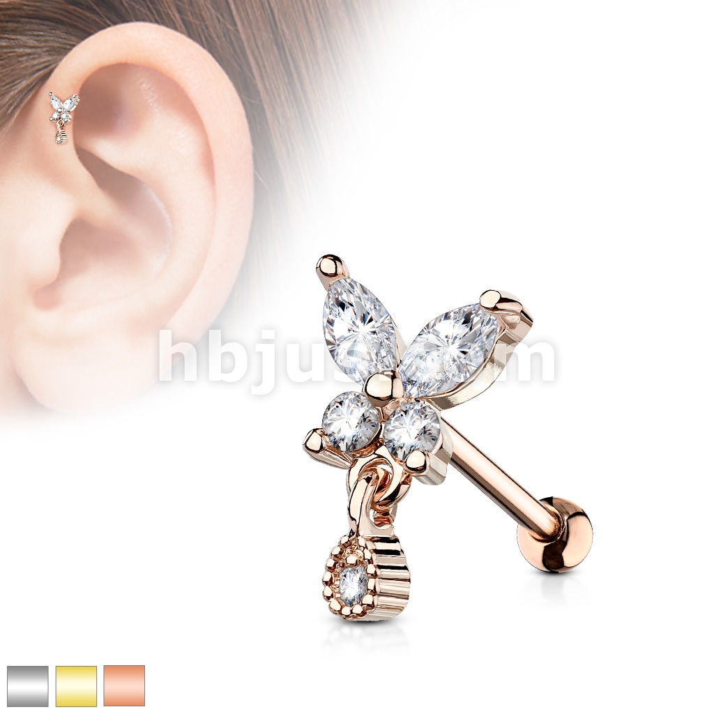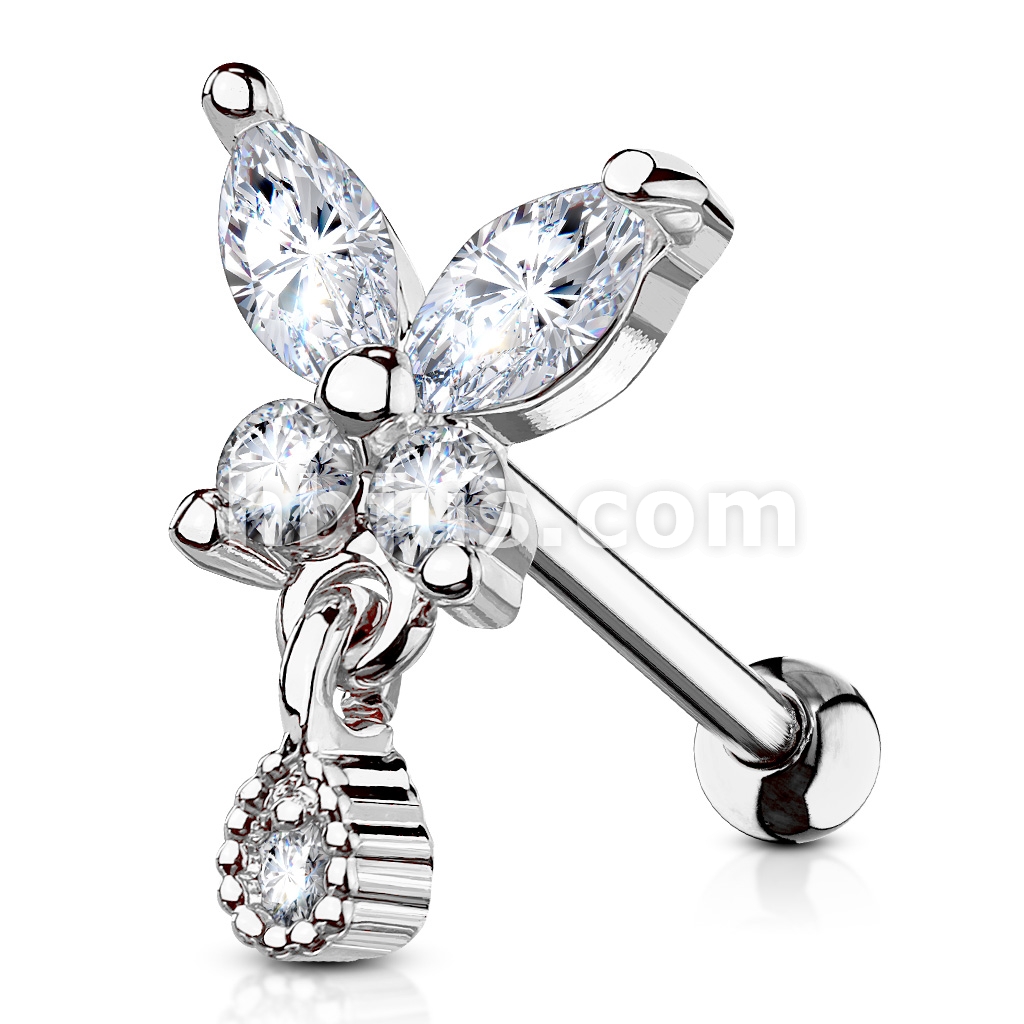 CZ Butterfly with tear Drop Dangle 316L Surgical Steel Cartilage, Tragus Barbell Studs