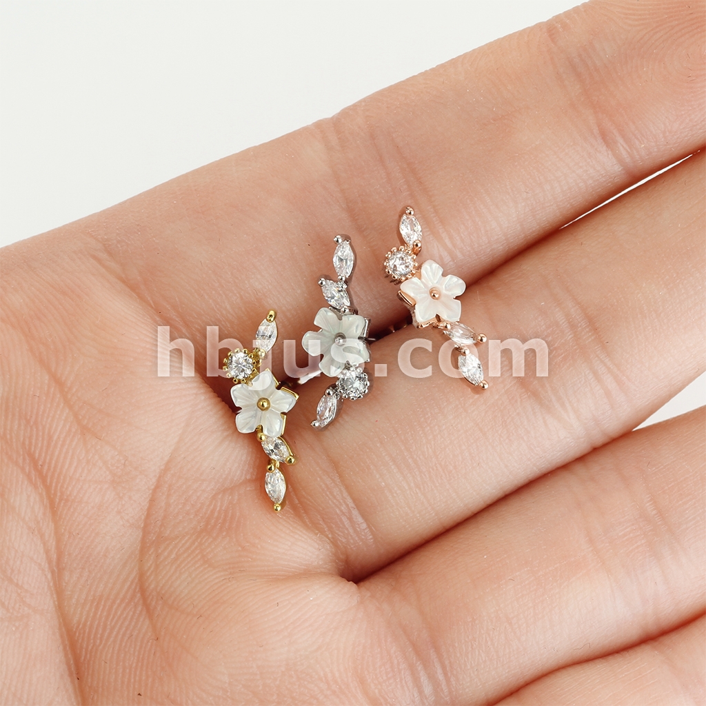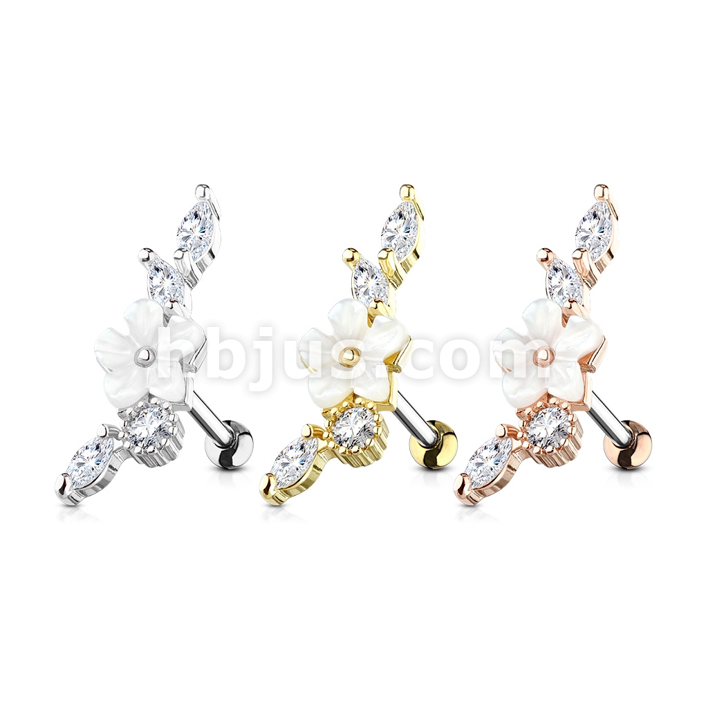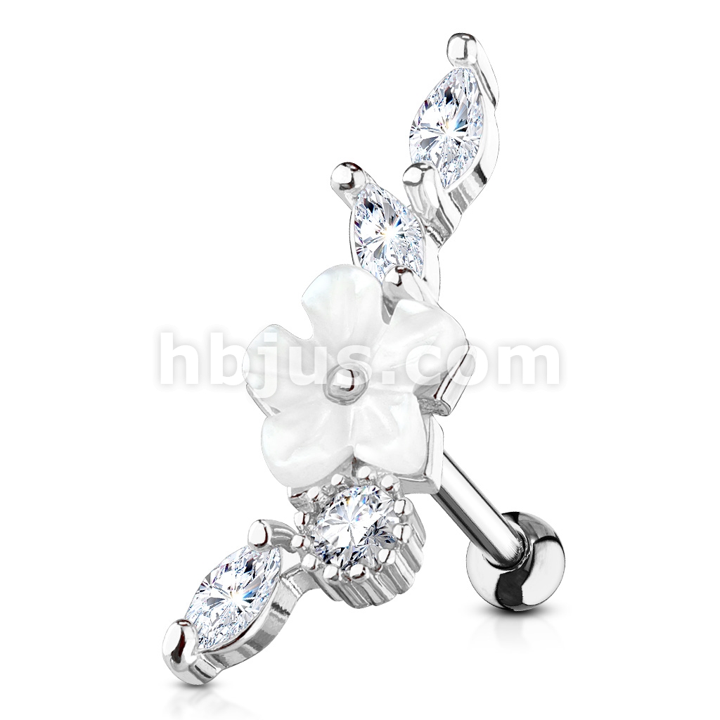Mother of Pearl Flower Centered CZ Vine 316L Surgical Steel Cartilage, Tragus Barbell Studs