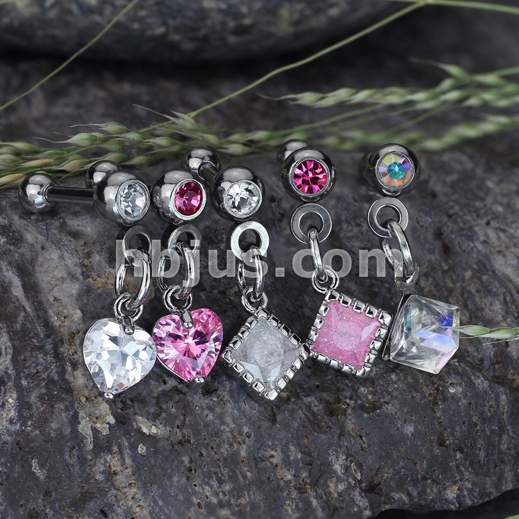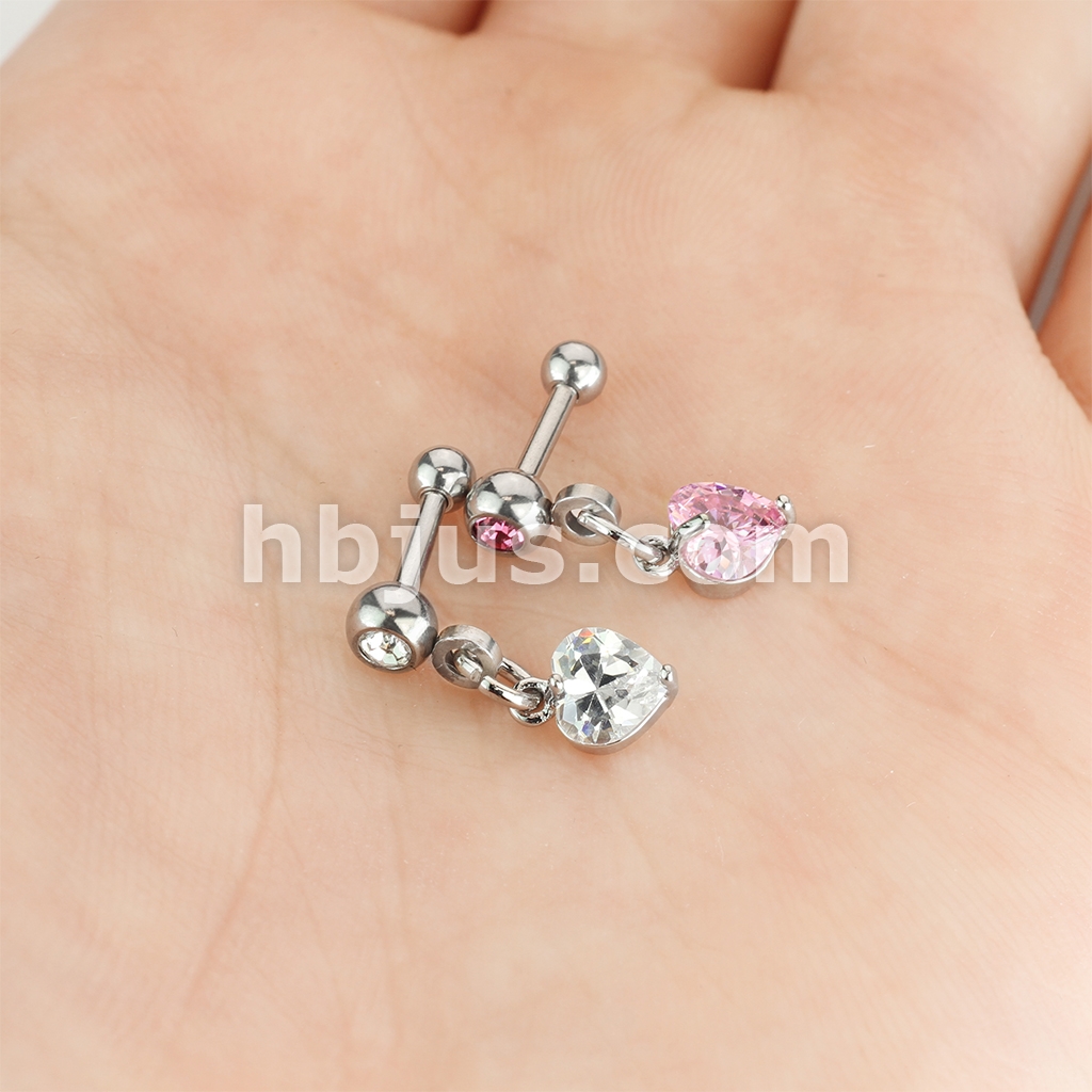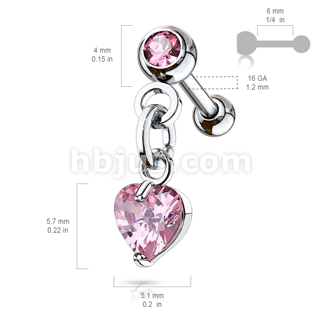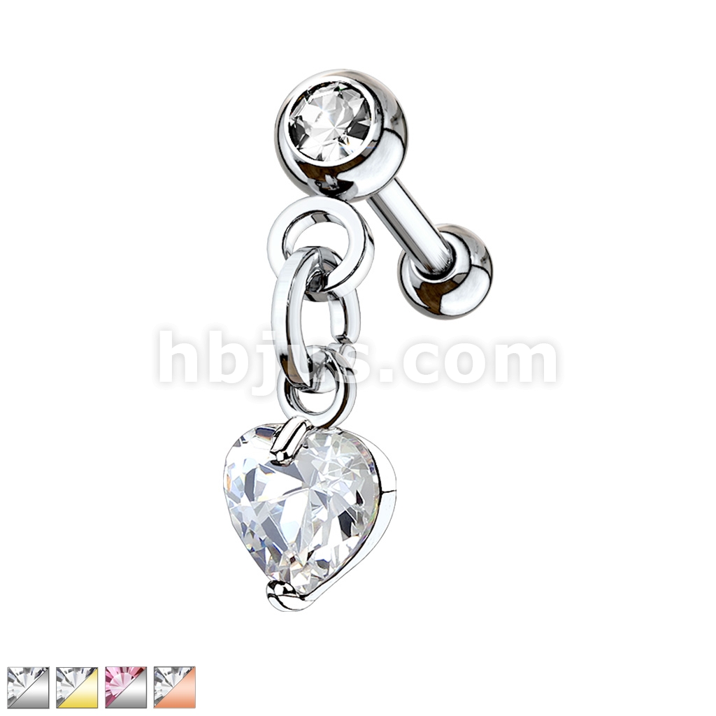 Crystal Set Ball with Prong Set Heart CZ Dangle 316L Surgical Steel Cartilage, Tragus Barbell Studs