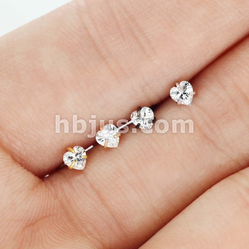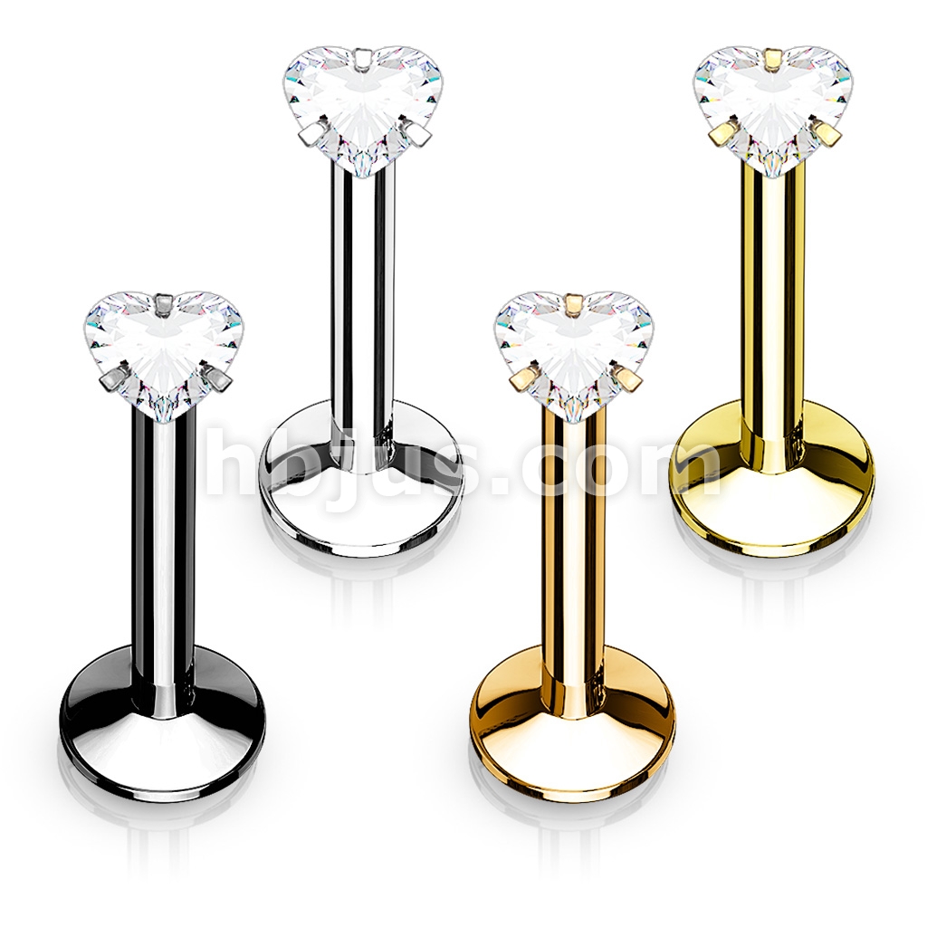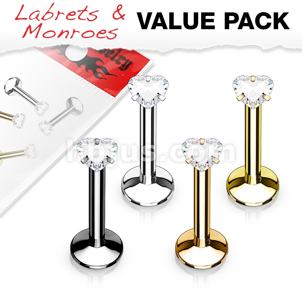 4 Pcs Value Pack Internally Threaded Heart Prong Top Gem Labret Monroe Titanium IP Over 316L Surgical Steel