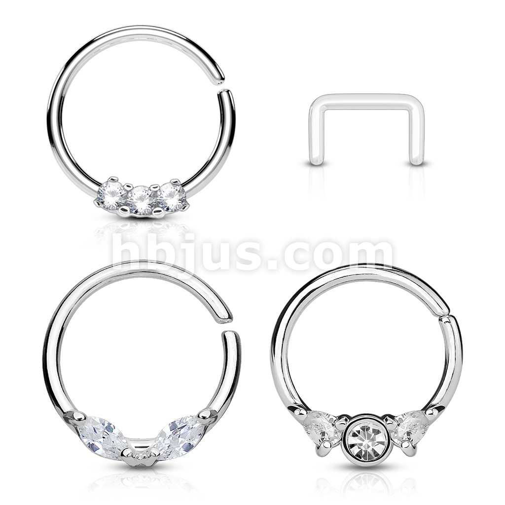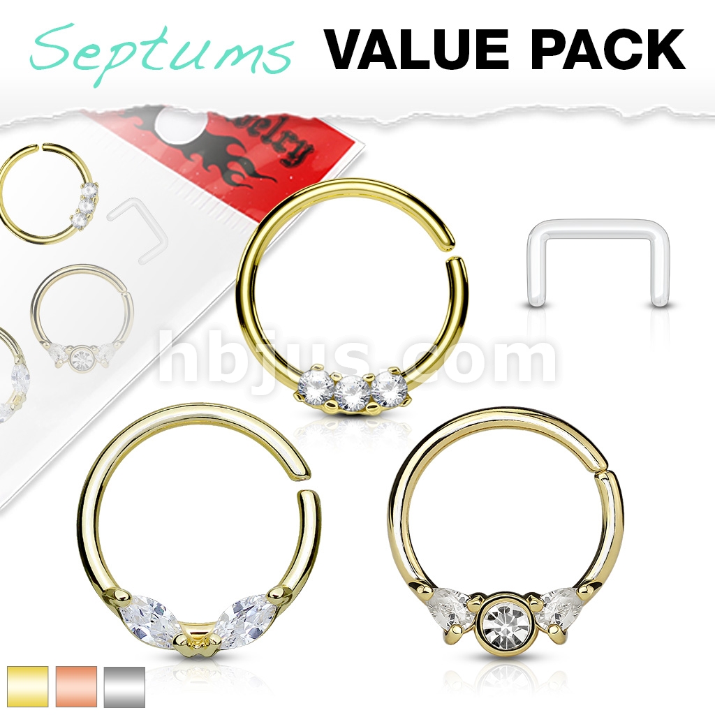 Includes 3 of our best selling bendable hoop rings used for septum or ear piercings. It also contains 1 septum retainer and is packaged together into a small bag ready to sell.