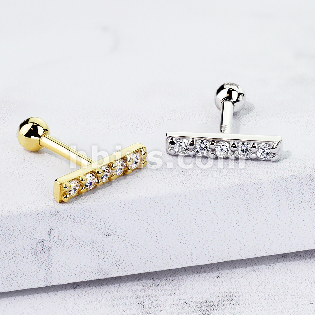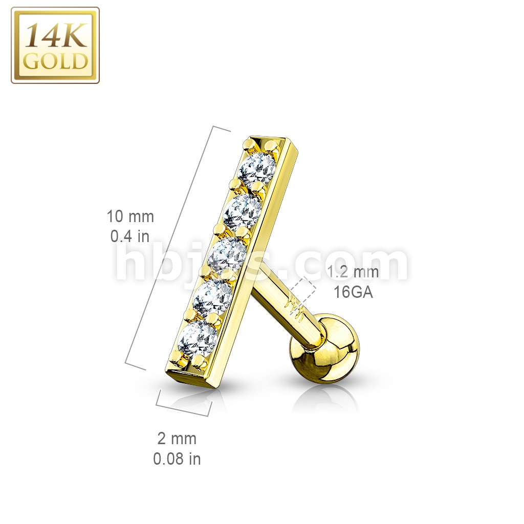 CZ Lined Set 10mm Long Bar Top 14K Gold Cartilage/Tragus Barbell