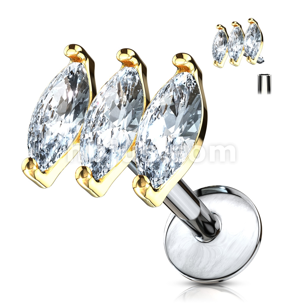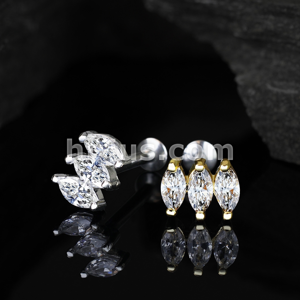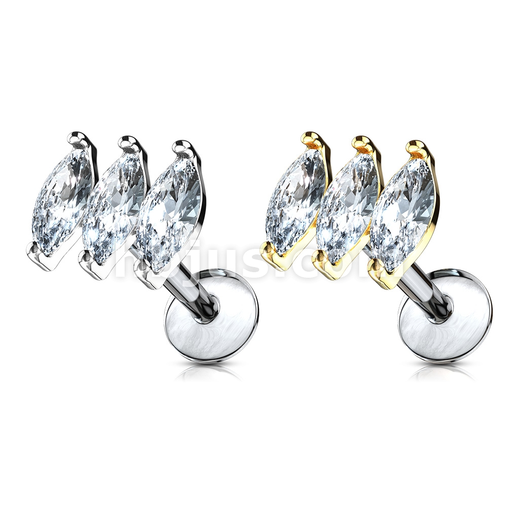Triple Marquise CZ Prong Set Top 316L Surgical Steel Internally Threaded Labret, Monroe, Ear Cartilage Studs