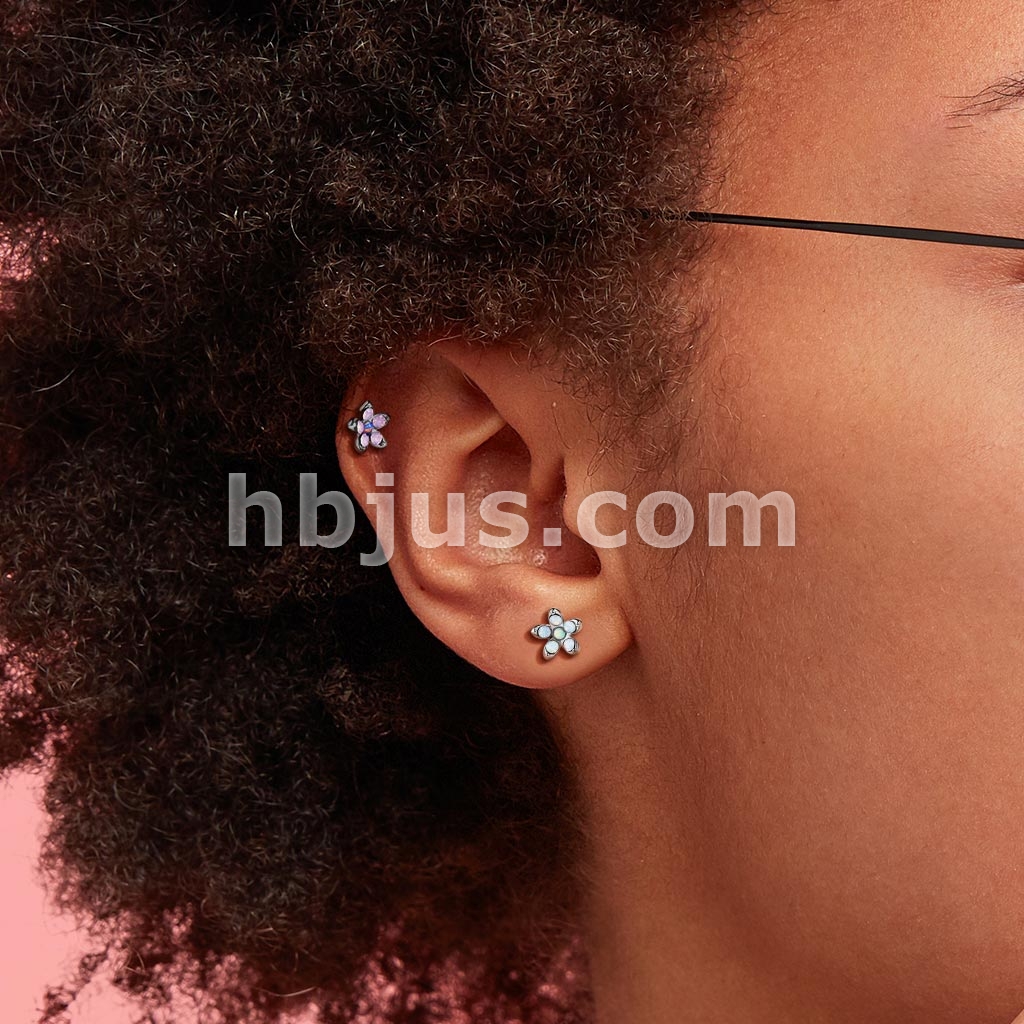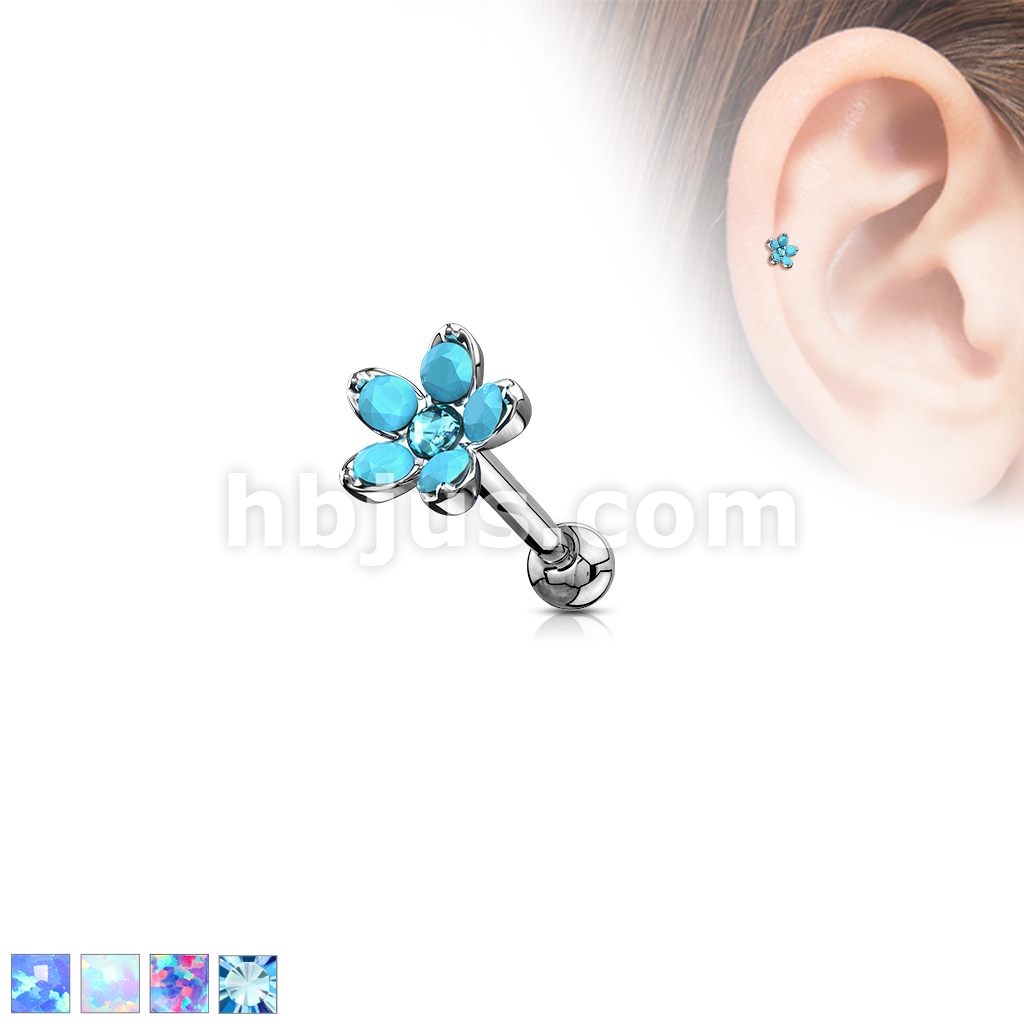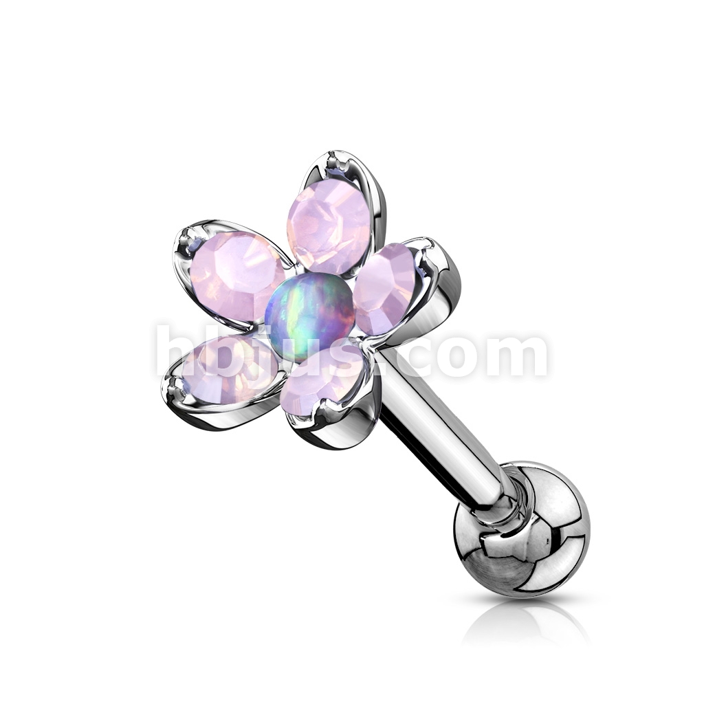Opalite Flower with Opal Center Top 316L Surgical Steel Cartilage, Tragus Barbell Studs