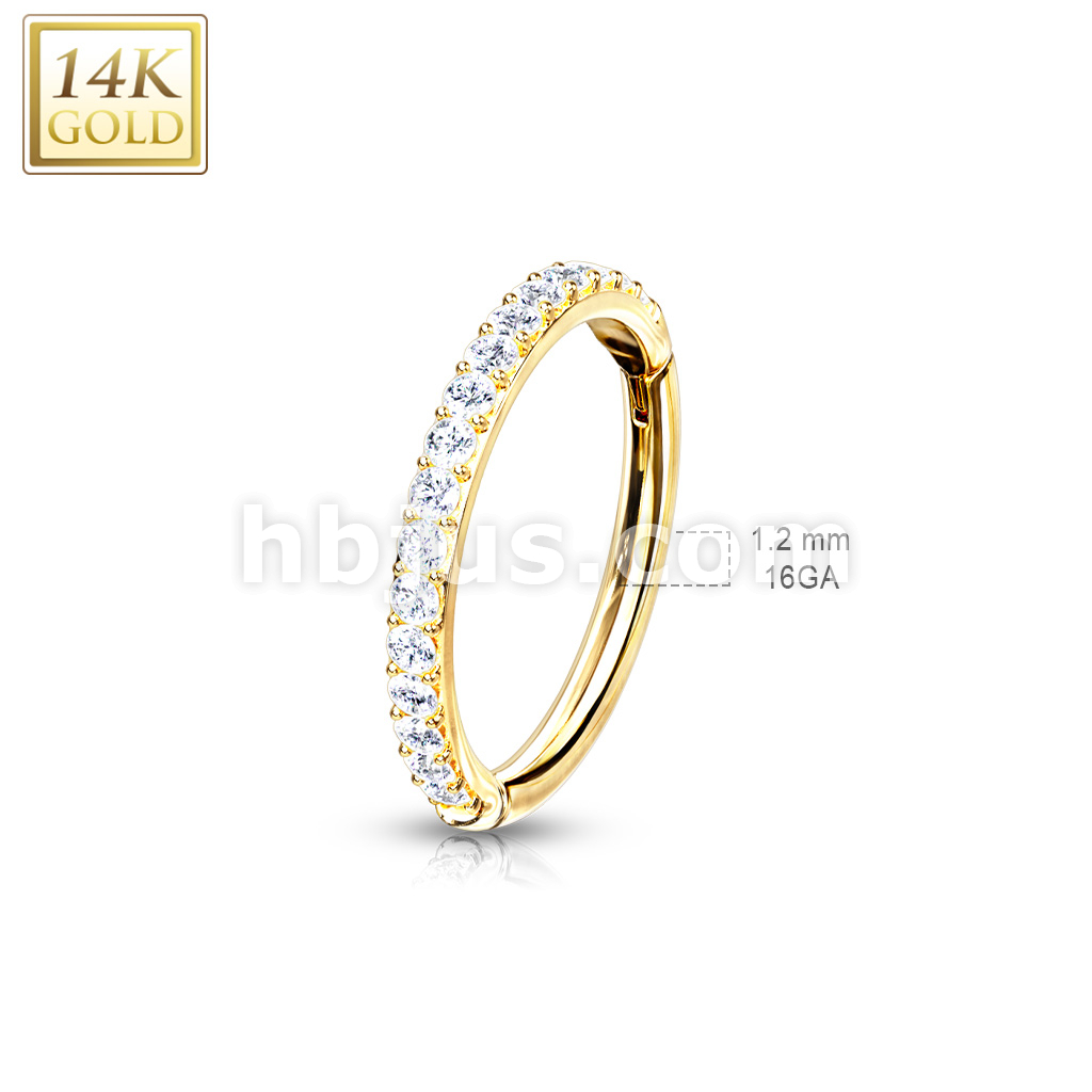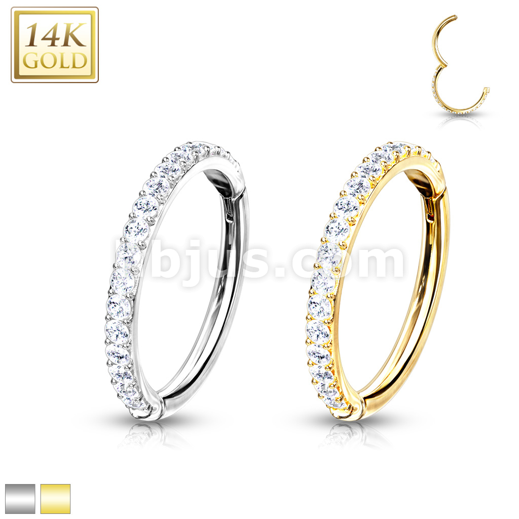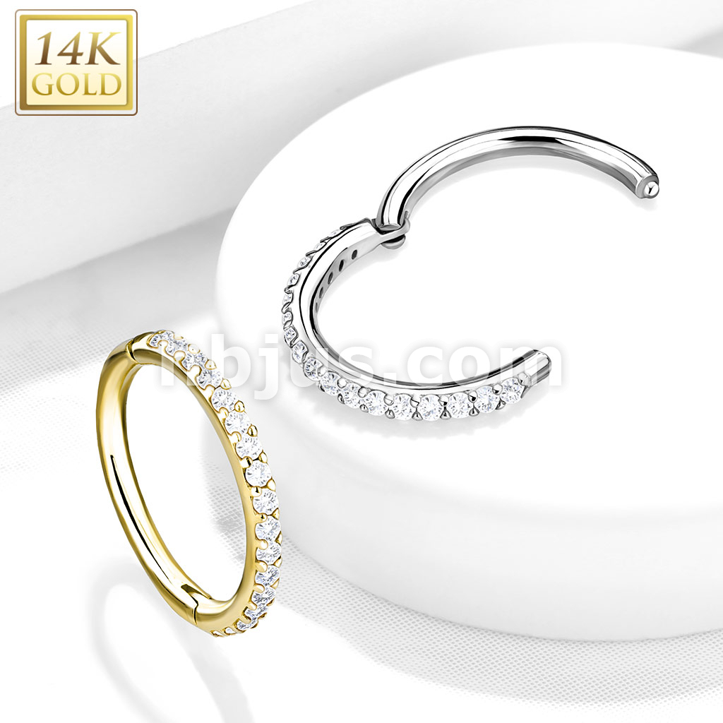 14K Gold Side CZ Paved Half Circle Hinged Hoop Rings for Cartilage, Tragus, Daith and More