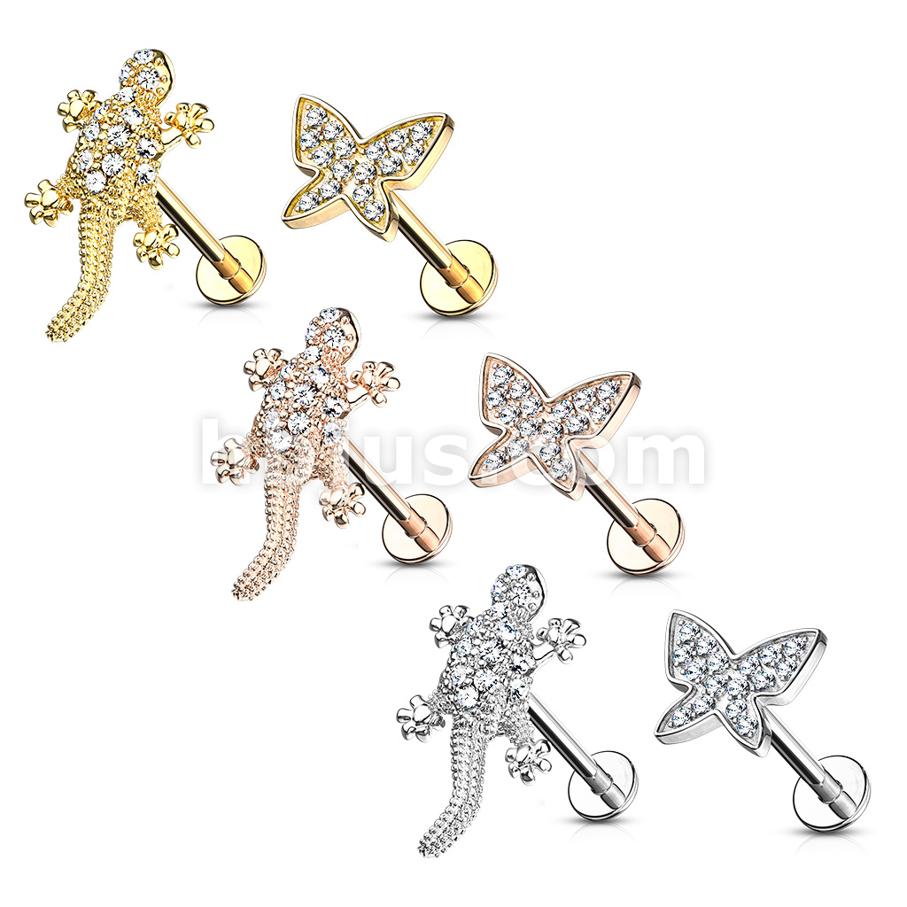 24 Pcs Pre Loaded Box of CZ Paved Lizard and Micro Paved CNC Set Butterfly 316L Surgical Steel Internally Threaded Labrets, Monroe, and Cartilage Studs Pack