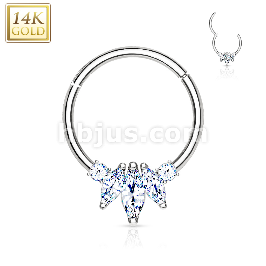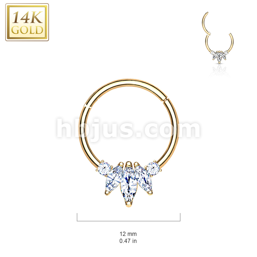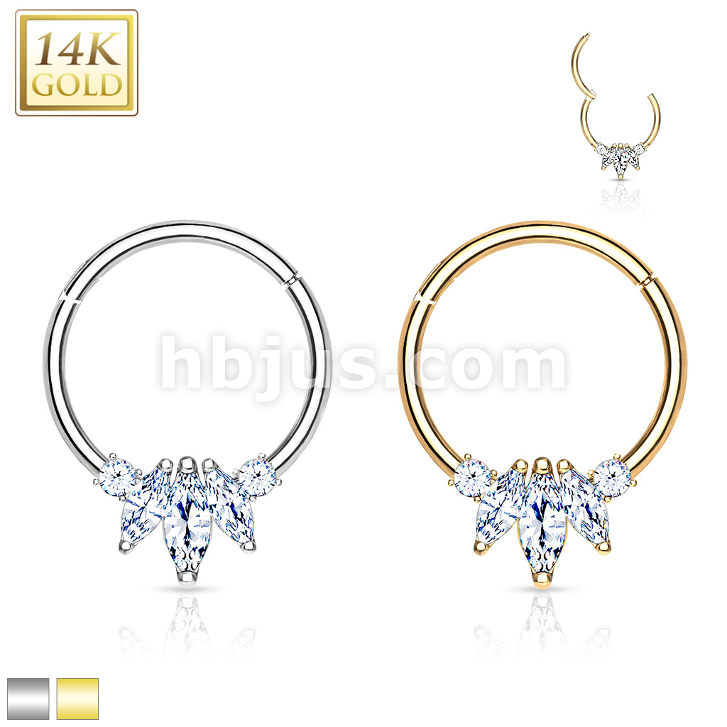 14K Gold Three Marquise CZ with Round CZ Hinged Hoop Rings for Nose Septum, Daith, and More