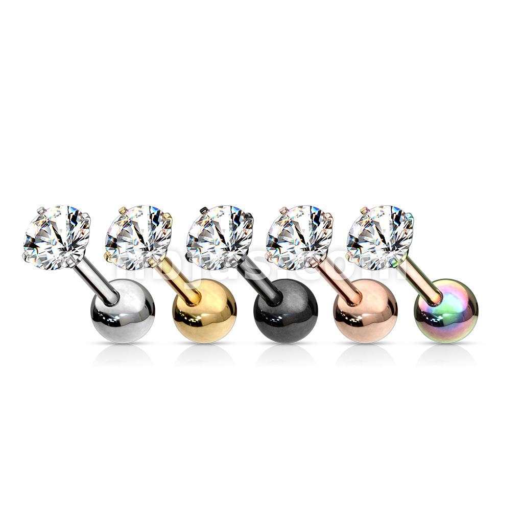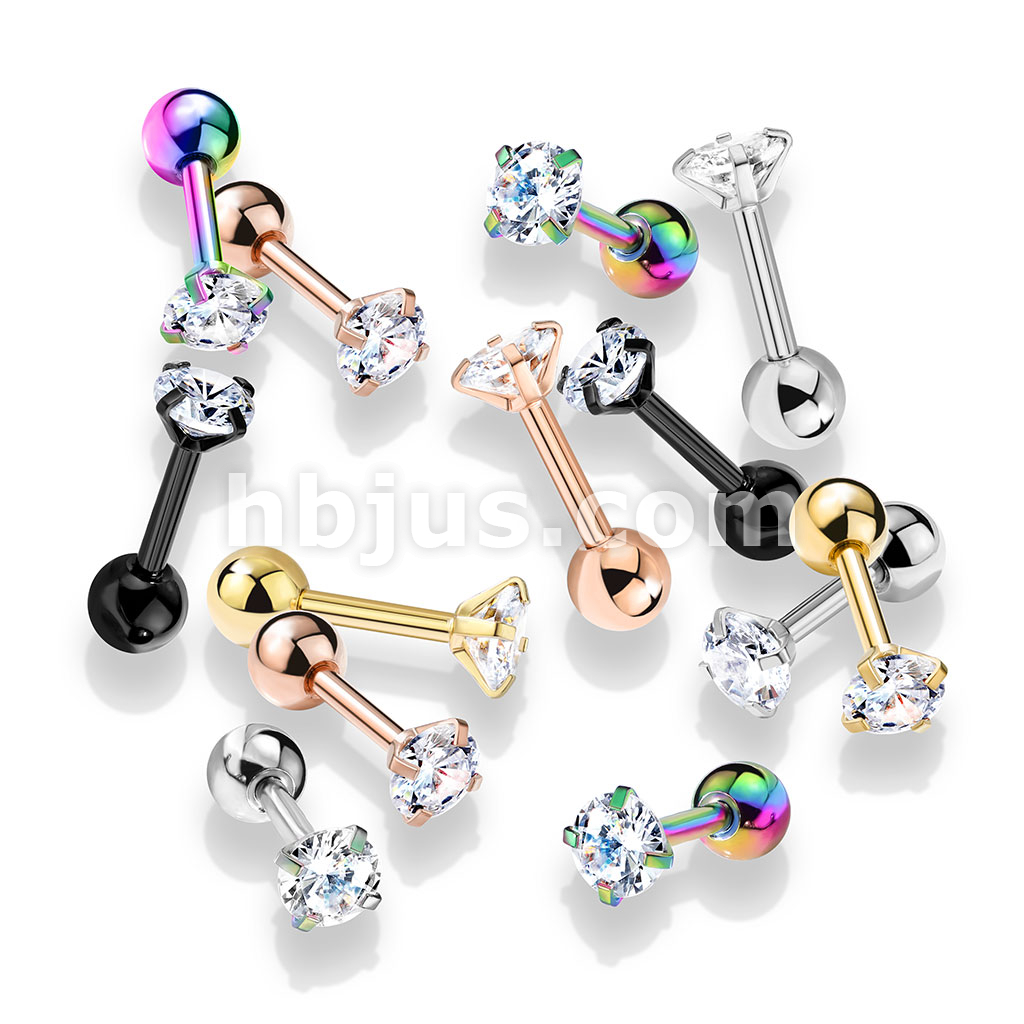 100 Pcs Prong Set Clear Round CZ PVD over 316L Surgical Steel Cartilage, Tragus Barbell Studs Bulk Pack (20 Pcs x 5 Colors)