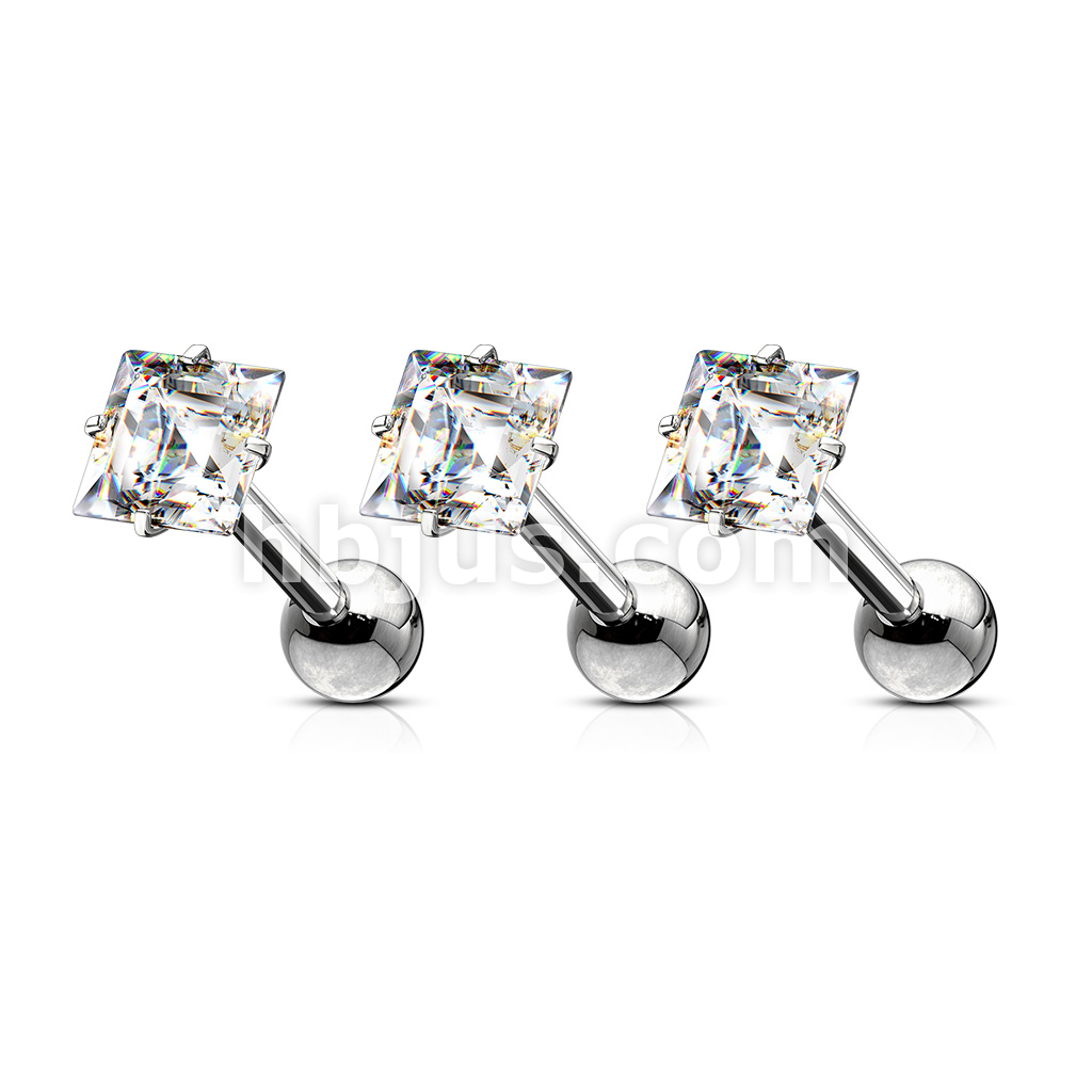 100 Pcs Prong Set Clear Square CZ 316L Surgical Steel Cartilage, Tragus Barbell Studs Bulk Pack