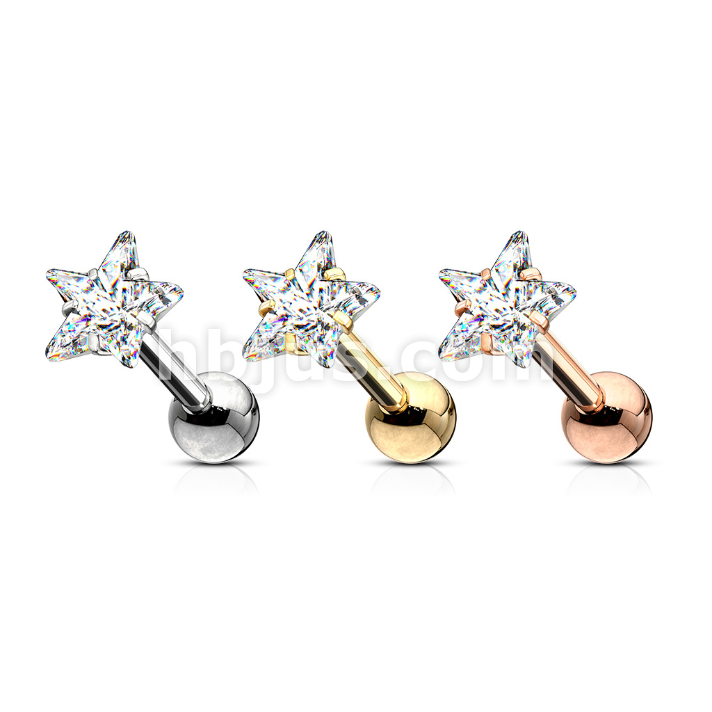 60 Pcs Prong Set Clear Star CZ PVD over 316L Surgical Steel Cartilage, Tragus Barbell Studs Bulk Pack (20 Pcs x 3 Colors)
