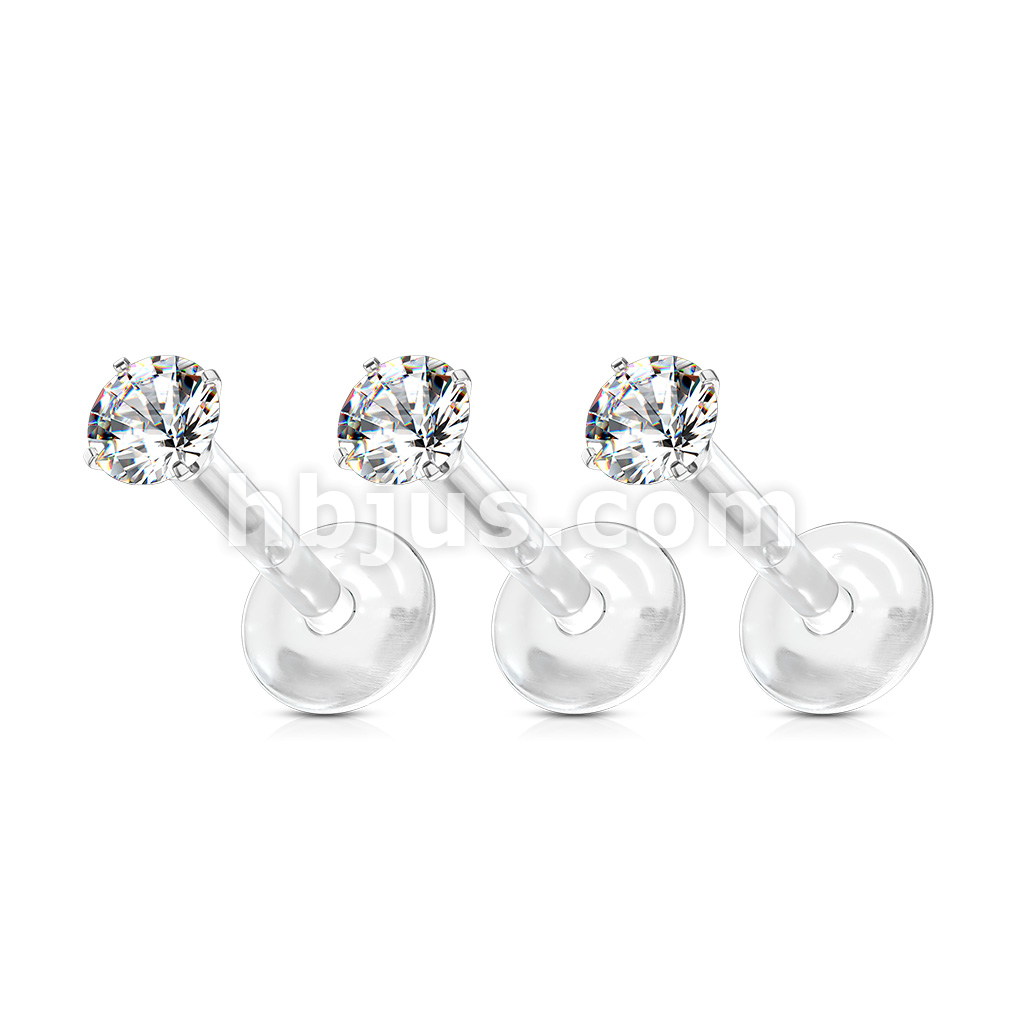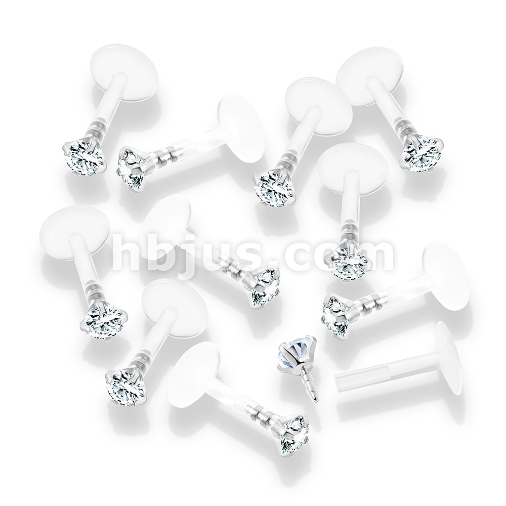 100 Pcs Prong Set Clear Round CZ 316L Surgical Steel Top Push In Bio Flex Flat Back Studs for Labret, Monroe, Ear Cartilage, and More