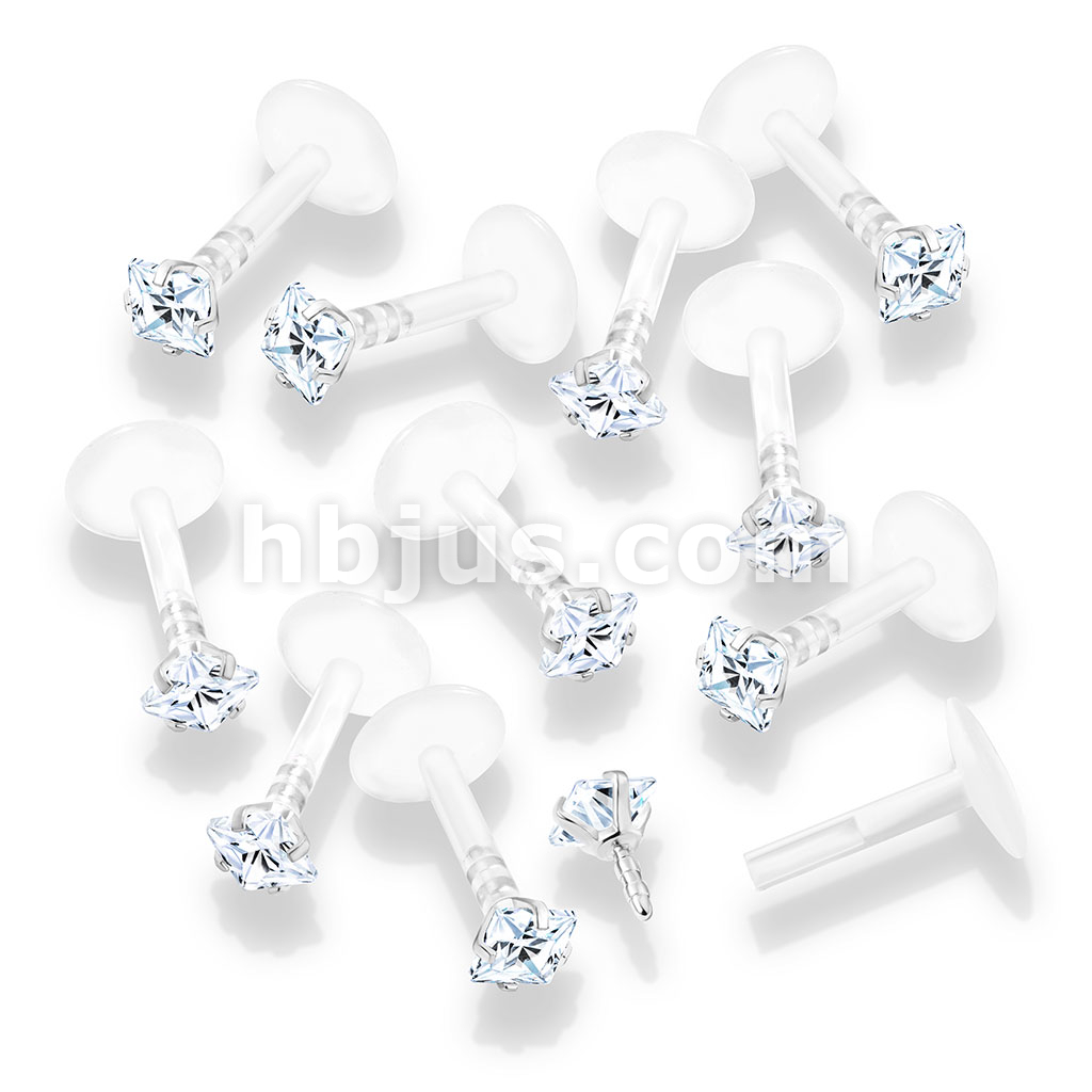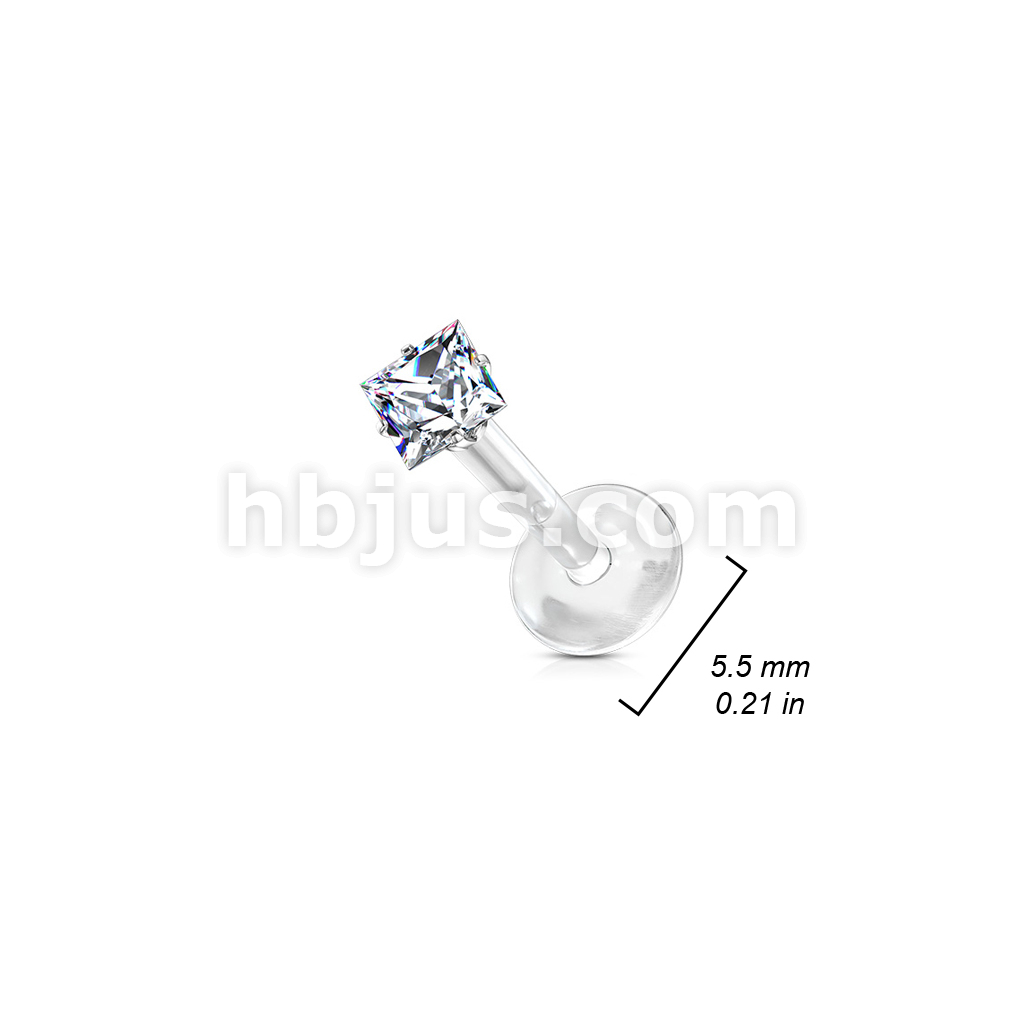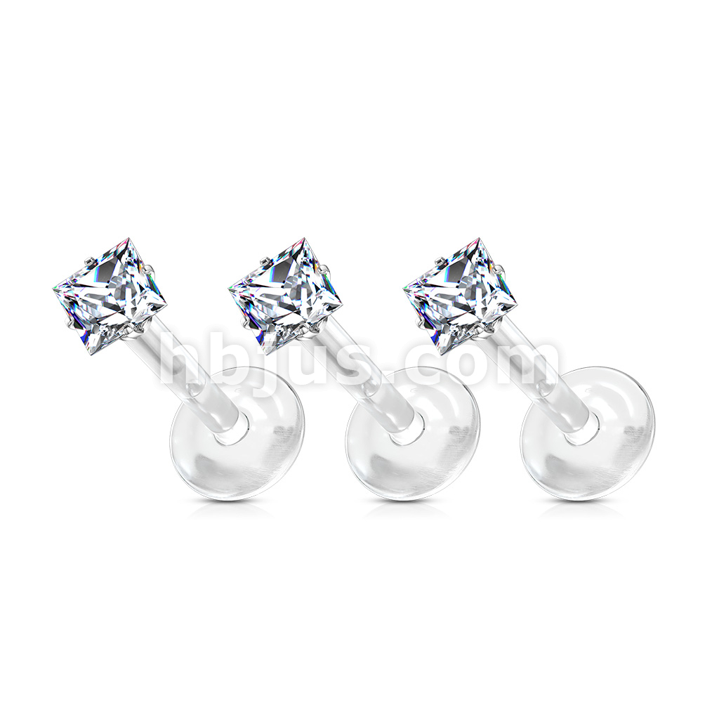 100 Pcs Prong Set Clear Square CZ 316L Surgical Steel Top Push In Bio Flex Flat Back Studs for Labret, Monroe, Ear Cartilage, and More