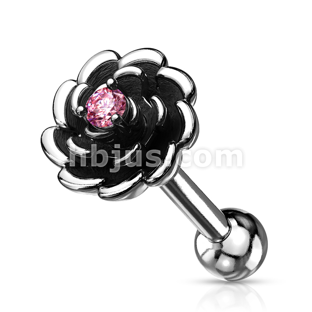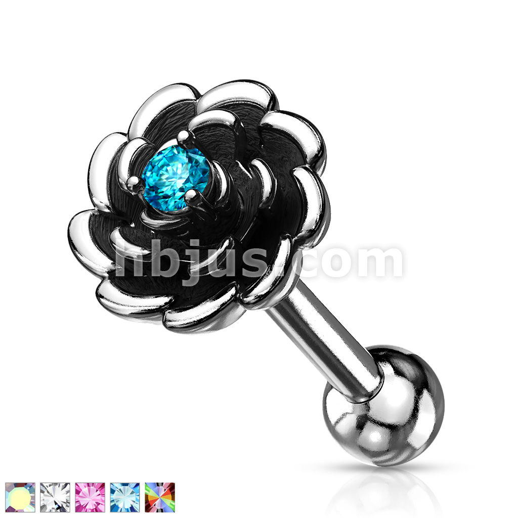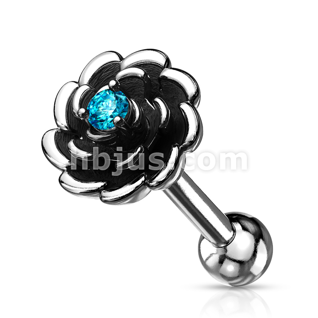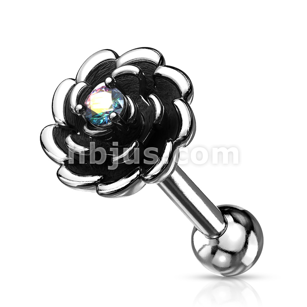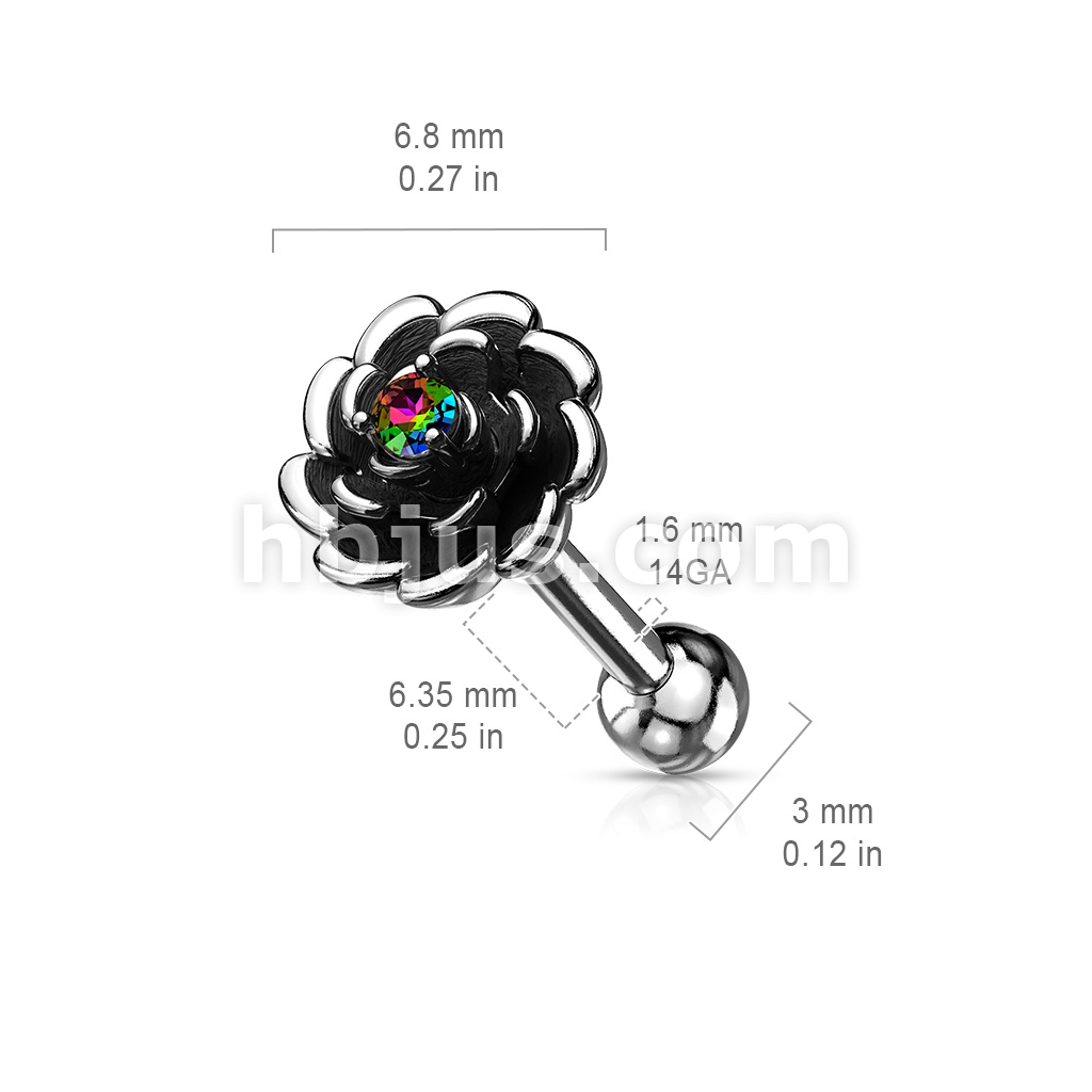 Antique Silver Plated Flower with Prong Set CZ Center 316L Surgical Steel Cartilage, Tragus Barbell Studs