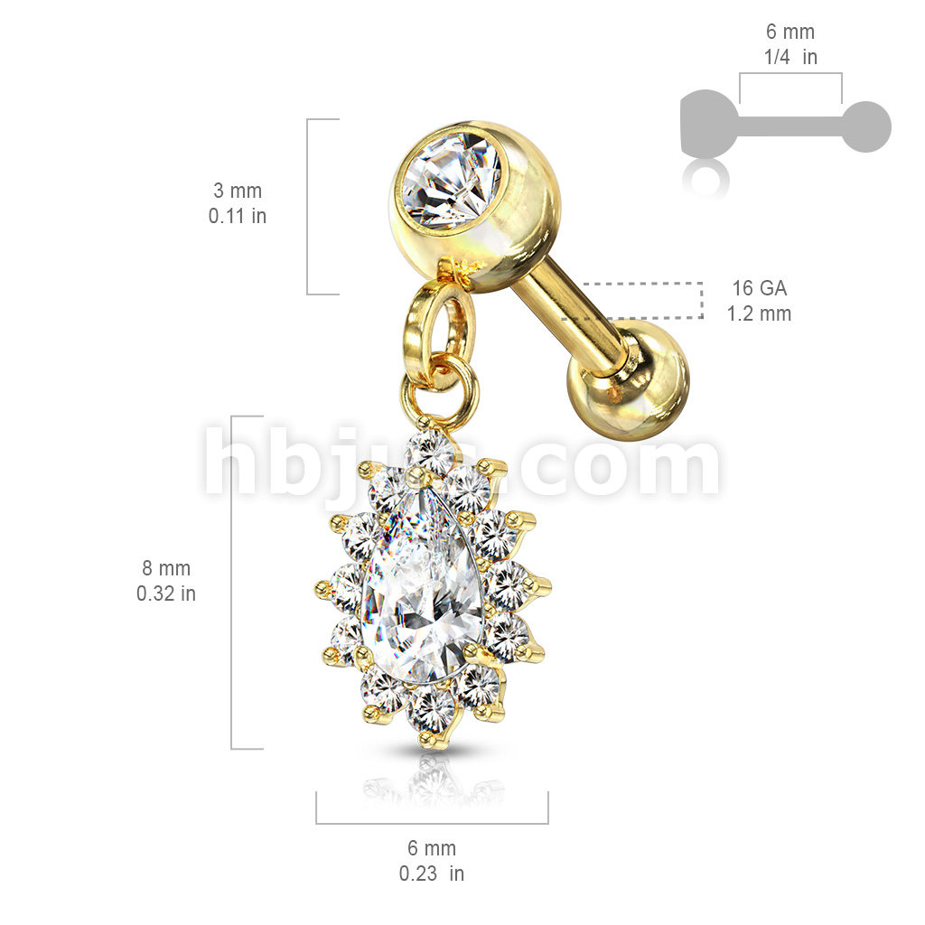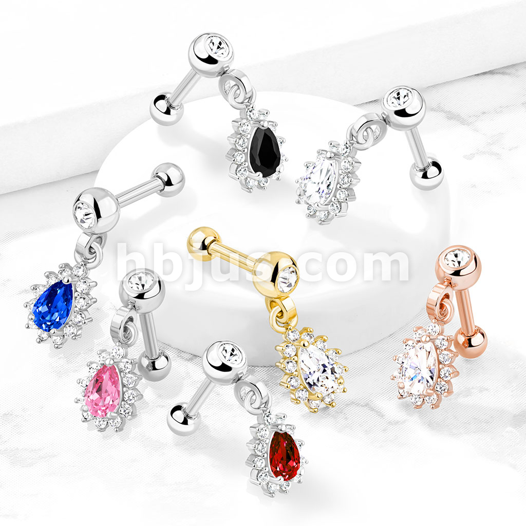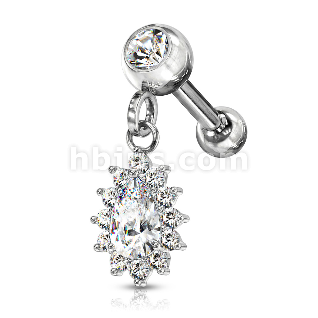 Pear CZ with Round CZ Surrounding Dangle Jeweled Set Ball 316L Surgical Steel Cartilage, Tragus Barbell Studs