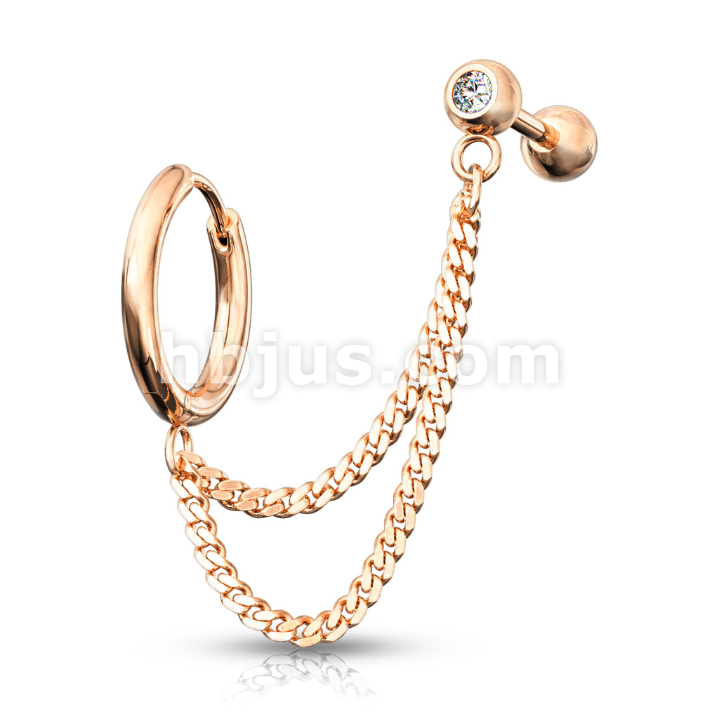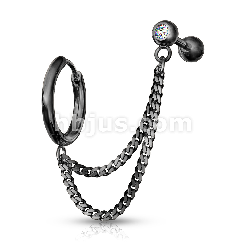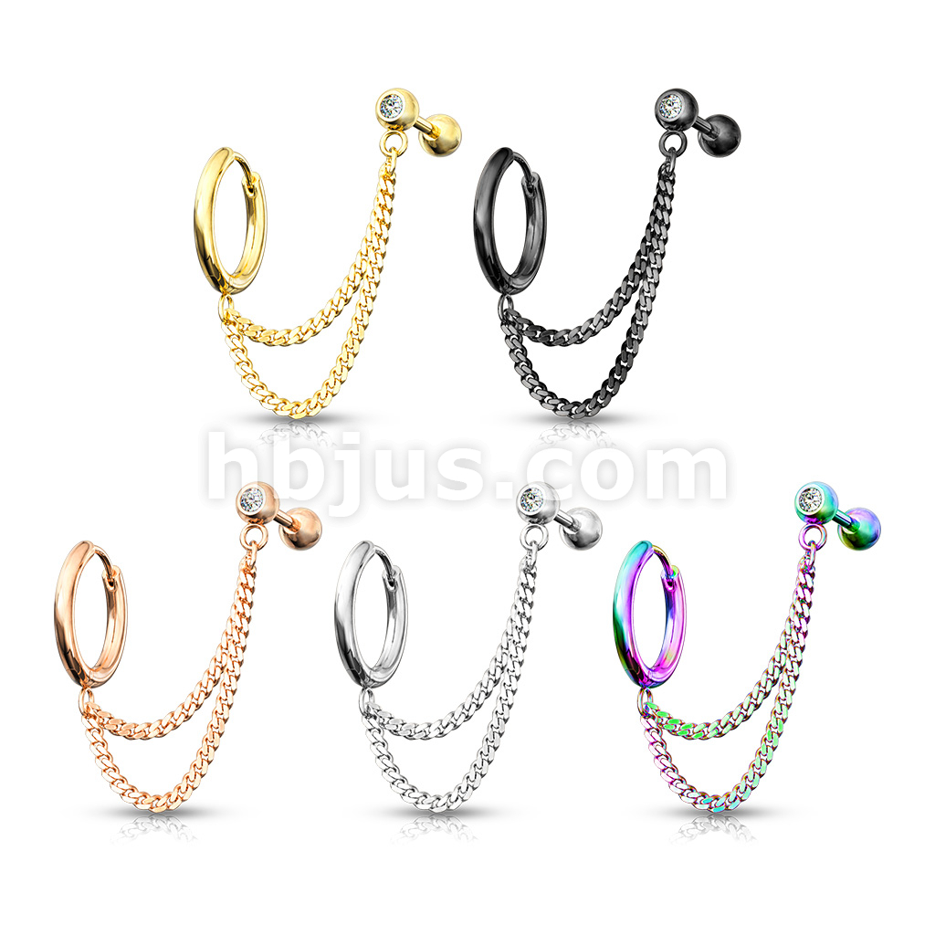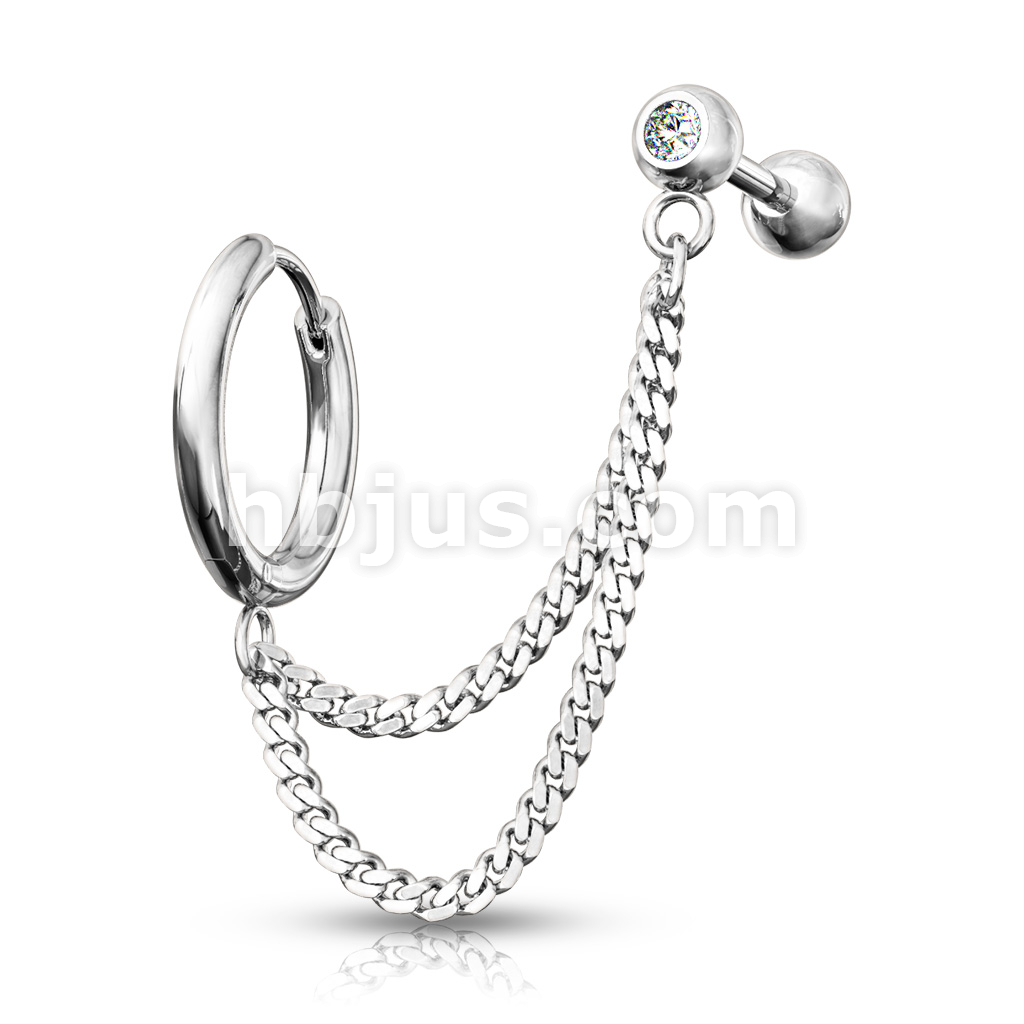 Double Chain Linked Round Clicker Hoop Earring and Crystal Set Cartilage Barbell 316L Surgical Steel