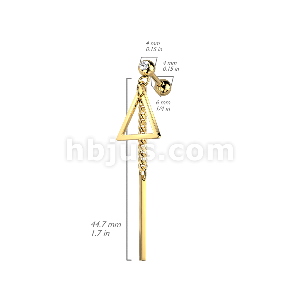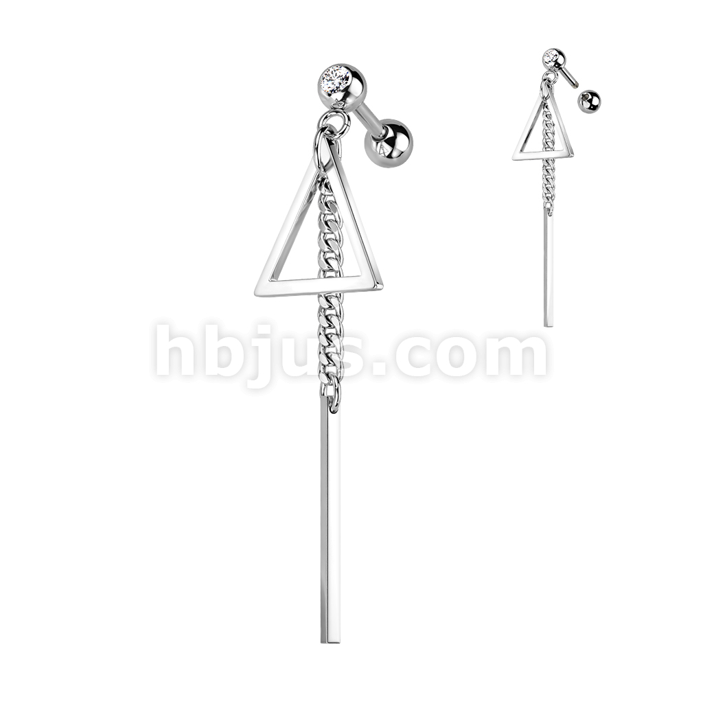 Bar on Chain and Triangle Dangle Crystal Set 316L Cartilage, Tragus Barbell Stud