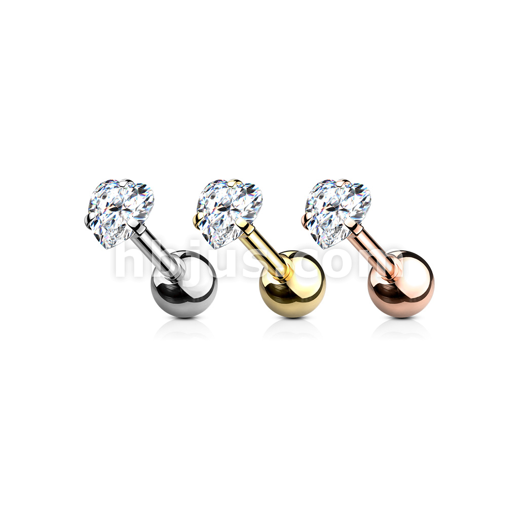 Prong Set Heart CZ 316L Surgical Steel Cartilage, Tragus Barbell Studs