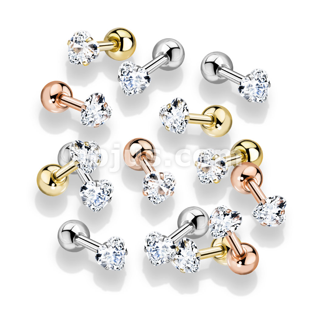 60 Pcs Prong Set Clear Heart CZ PVD over 316L Surgical Steel Cartilage, Tragus Barbell Studs Bulk Pack (20 Pcs x 3 Colors)