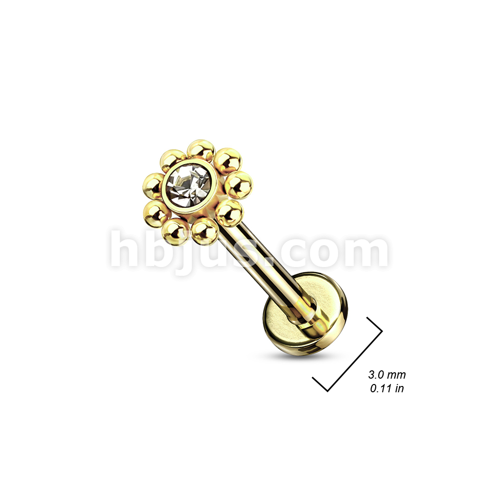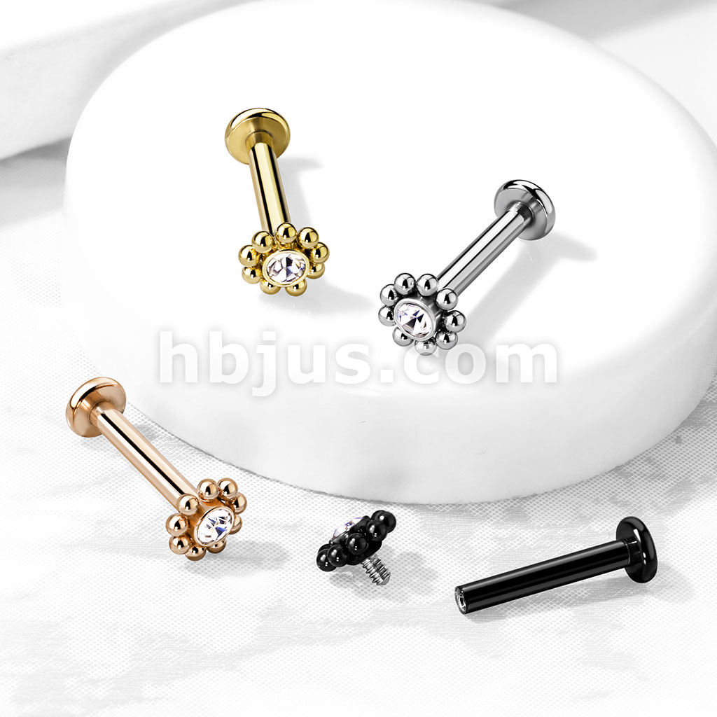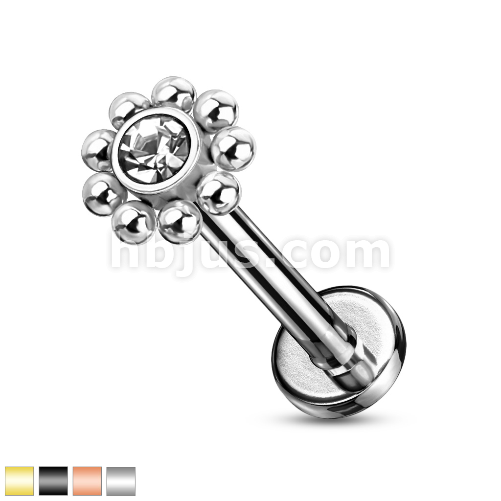 Steel Balls Around Gem Set Ball Top 316L Surgical Steel Internal Thread Flat Back Studs for Labret, Monroe, Ear Cartilage and More