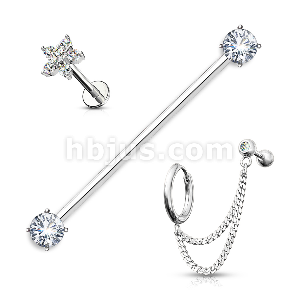 3 Pcs Prong Set CZ Industrial Barbell, Double Chain Link Barbell and Hoop, CZ Flower Labret Stud 316L Surgical Steel Ear Cartilage Mix Value Pack
