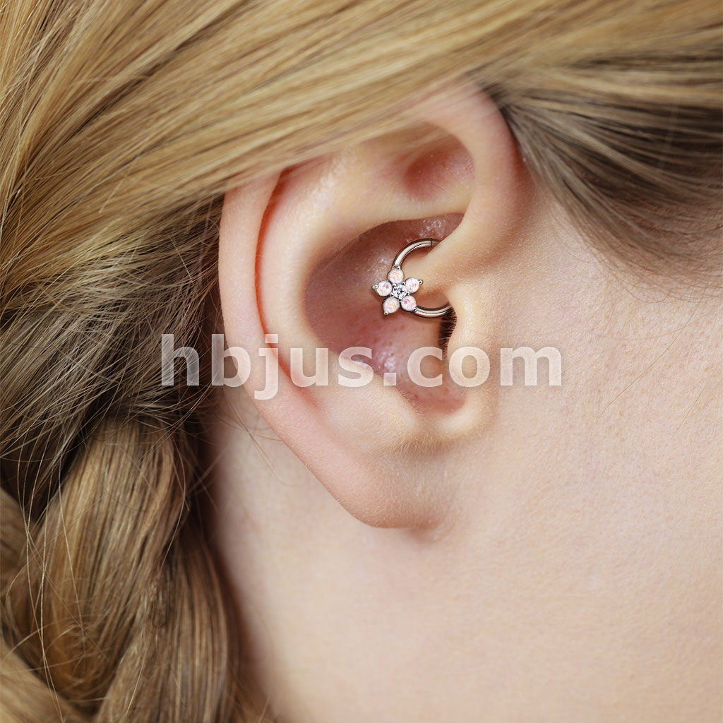 Opal Glitter Flower Centered 316L Surgical Steel Hinge Hoops for Ear Cartialge, Daith, Nose Septum and More
